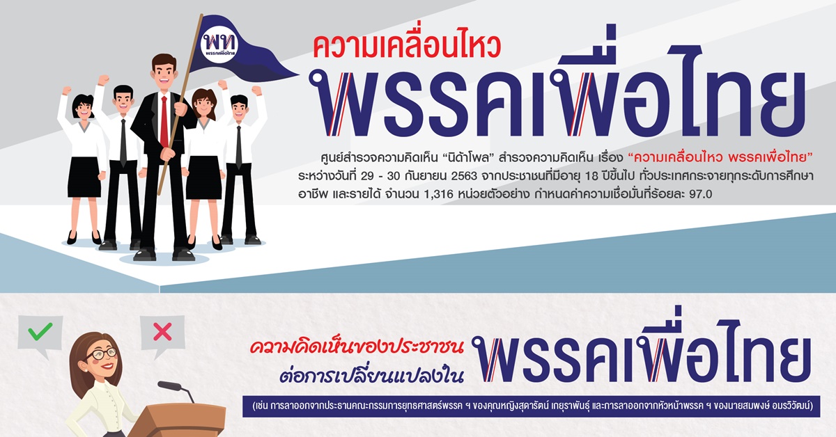 ศูนย์สำรวจความคิดเห็น “นิด้าโพล” สถาบันบัณฑิตพัฒนบริหารศาสตร์ (นิด้า) เปิดเผยผลสำรวจของประชาชน เรื่อง “ความเคลื่อนไหว พรรคเพื่อไทย” ทำการสำรวจระหว่างวันที่ 29 – 30 กันยายน 2563 จากประชาชนที่มีอายุ 18 ปีขึ้นไป กระจายทุกภูมิภาค ระดับการศึกษา และอาชีพทั่วประเทศ รวมทั้งสิ้น จำนวน 1,316 หน่วยตัวอย่าง เกี่ยวกับการเปลี่ยนแปลงในพรรคเพื่อไทย การสำรวจอาศัยการสุ่มตัวอย่างโดยใช้ความน่าจะเป็นจากบัญชีรายชื่อฐานข้อมูลตัวอย่างหลัก (Master Sample) ของ “นิด้าโพล” สุ่มตัวอย่างด้วยวิธีแบบง่าย (Simple Random Sampling) เก็บข้อมูลด้วยวิธีการสัมภาษณ์ทางโทรศัพท์โดยกำหนดค่าความเชื่อมั่นที่ร้อยละ 97.0
