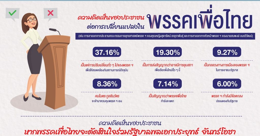 จากการสำรวจเมื่อถามถึงความคิดเห็นของประชาชนต่อการเปลี่ยนแปลงในพรรคเพื่อไทย (เช่น การลาออกจากประธานคณะกรรมการยุทธศาสตร์พรรค ฯ ของคุณหญิงสุดารัตน์ เกยุราพันธุ์ และการลาออกจากหัวหน้าพรรค ฯ ของนายสมพงษ์ อมรวิวัฒน์) พบว่า ส่วนใหญ่ร้อยละ 37.16 ระบุว่า เป็นแค่การปรับเปลี่ยนทั่ว ๆ ไปของพรรค ฯ เพื่อให้สอดคล้องกับสถานการณ์ปัจจุบัน รองลงมา ร้อยละ 19.30 ระบุว่า เป็นการส่งสัญญาณว่าอาจมีการยุบสภาเพื่อเลือกตั้งใหม่เร็ว ๆ นี้ ร้อยละ 9.27 ระบุว่า เป็นกลลวงทางการเมืองของพรรค ฯ ในการเอาชนะรัฐบาล ร้อยละ 8.36 ระบุว่า คนในตระกูลชินวัตรจะเข้ามาควบคุมพรรค ฯ เอง ร้อยละ 7.14 ระบุว่า เป็นสัญญาณว่าพรรคเพื่อไทยกำลังจะแตก ร้อยละ 6.00 ระบุว่า พรรค ฯ กำลังมีข้อตกลงปรองดองกับรัฐบาล ร้อยละ 4.71 ระบุว่า พรรค ฯ เตรียมเข้าร่วมรัฐบาล พลเอกประยุทธ์ จันทร์โอชา ร้อยละ 3.65 ระบุว่า เป็นการส่งสัญญาณว่าพรรค ฯ ไม่สนับสนุนกลุ่มแนวร่วมธรรมศาสตร์และการชุมนุม ร้อยละ 0.23 ระบุว่า อื่น ๆ ได้แก่ มีการเตรียมตัวเพื่อลงสมัครการเมืองท้องถิ่น และเกิดความขัดแย้งภายในพรรค และร้อยละ 17.25 ระบุว่า ไม่ทราบ/ไม่ตอบ/ไม่สนใจ