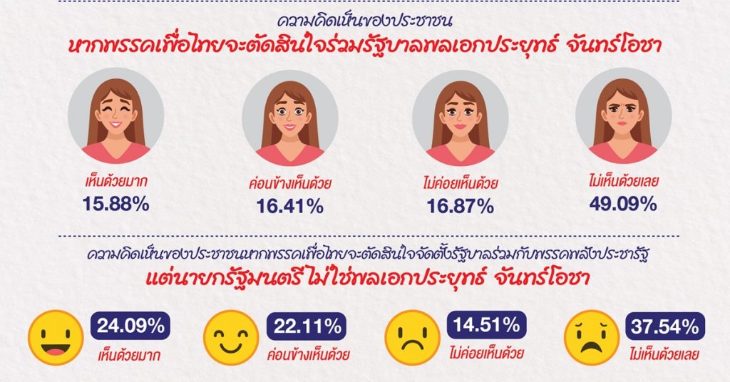 ด้านความคิดเห็นของประชาชนหากพรรคเพื่อไทยจะตัดสินใจร่วมรัฐบาลพลเอกประยุทธ์ จันทร์โอชา พบว่า ร้อยละ 15.88 ระบุว่า เห็นด้วยมาก เพราะ เพื่อลดความขัดแย้งทางการเมือง เพื่อประเทศจะได้เดินหน้าต่อไปได้ ขณะที่บางส่วนระบุว่า จะได้ช่วยกันบริหารประเทศให้ดีขึ้น เนื่องจากพรรคเพื่อไทยมีประสบการณ์การทำงานทางการเมืองมานาน ร้อยละ 16.41 ระบุว่า ค่อนข้างเห็นด้วย เพราะ เพื่อลด ความขัดแย้งทางการเมือง สร้างการปรองดอง ขณะที่บางส่วนระบุว่า จะสามารถช่วยกันแก้ไขปัญหาต่าง ๆให้ดีขึ้นได้ ร้อยละ 16.87 ระบุว่า ไม่ค่อยเห็นด้วย เพราะ มีแนวทางการทำงานทางการเมืองไม่เหมือนกัน มีอุดมการณ์ที่แตกต่างกัน จึงทำให้ทำงานร่วมกันได้ค่อนข้างยาก ร้อยละ 49.09 ระบุว่า ไม่เห็นด้วยเลย เพราะ แนวคิด จุดยืนทางการเมือง การทำงานมีความแตกต่างกันซึ่งถ้าเข้าร่วมอาจจะทำให้เกิดปัญหาตามมาในภายหลังได้ และร้อยละ 1.75 ระบุว่า ไม่ทราบ/ไม่ตอบ/ไม่สนใจ