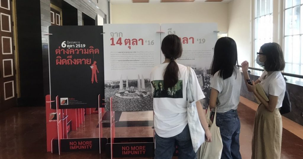 ผู้สื่อข่าวรายงานว่า บรรยากาศงาน “ครบรอบ 44 ปี 6 ตุลาฯ 2519” ประจำปี 2563 ที่หอประชุมศรีบูรพา มหาวิทยาลัยธรรมศาสตร์ ท่าพระจันทร์ วันนี้ ( 5 ต.ค.) จัดโดยเครือข่ายเดือนตุลาฯ 2519 ยังเดินหน้าตามปกติ โดยในเวลา 14.00-15.00 น. เป็นการฉายภาพยนตร์ 6 ตุลา 2519 ซึ่งเป็นภาพจากเหตุการณ์จริง จากนั้น ในเวลา 15.00-16.00 น.เป็นการแสดงรายการศิลปวัฒนธรรม ก่อนที่ในเวลา 16.00-18.00 น. จะเป็นการเสวนา 6 ตุลา ในทัศนคติคนรุ่นใหม่ ซึ่งตามกำหนดการเดิม มีชื่อของแกนนำเยาวชนในกลุ่มต่าง ๆ ร่วมเสวนา ประกอบด้วย นายพริษฐ์ ชิวารักษ์ แกนนำกลุ่มแนวร่วมธรรมศาสตร์และการชุมนุม น.ส.ภัสราวลี ธนกิจวิบูลย์ผล นายสิรภพ อัตโตหิ และนายลภนพัฒน์ หวังไพสิฐ หรือ น้องมิน