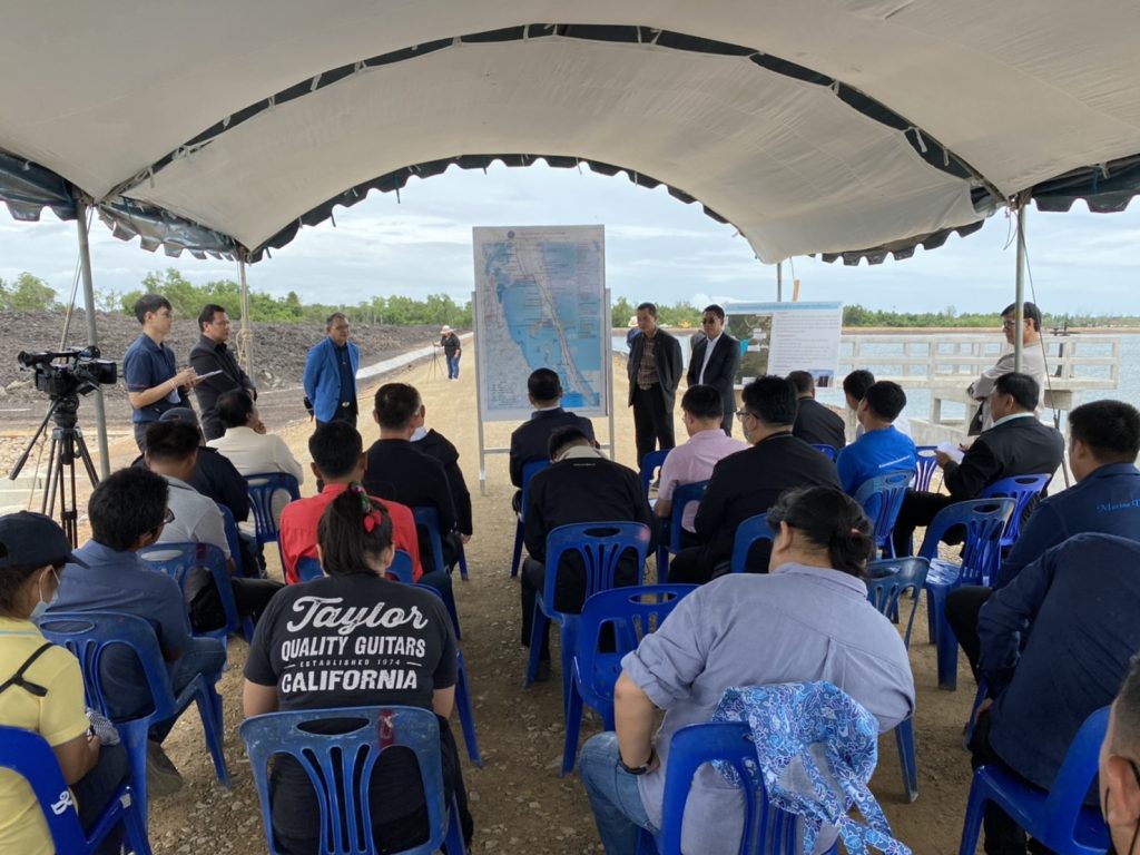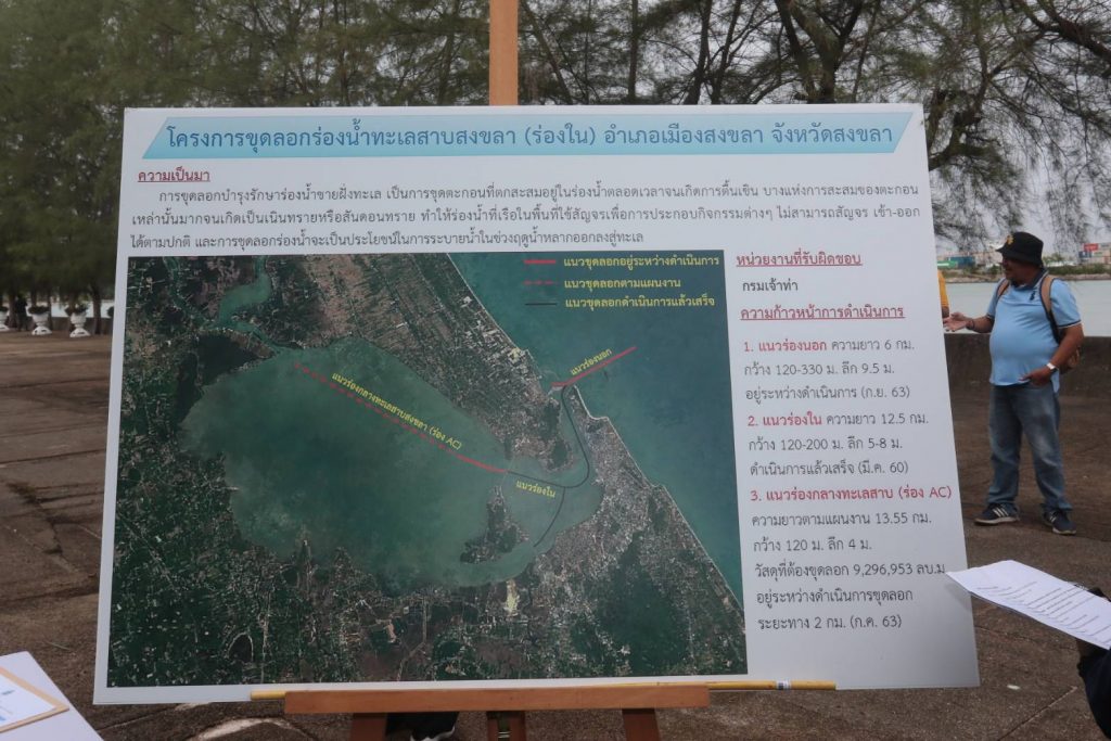 ในการลงพื้นที่ในวันนี้ คณะเลขาธิการ สทนช. ได้ติดตามความก้าวหน้าการดำเนินการที่สอดคล้องกับการศึกษาที่เกี่ยวกับตะกอนในทะเลสาบสงขลา ได้แก่ การดำเนินการขุดลอกร่องน้ำทะเลสาบสงขลา (ร่องใน) ของกรมเจ้าท่า บริเวณแหลมสนอ่อน ต.บ่อยาง อ.เมือง จ.สงขลา เป็นจุดที่มีความสำคัญต่อเศรษฐกิจมาก เนื่องจากเป็นร่องน้ำทางเดินเรือของเรือสินค้าขนาดกลางที่มาขนถ่ายสินค้าขึ้น-ลงบริเวณท่าเรือเอกชน รวมถึงเรือประมงที่มาขนถ่ายสัตว์น้ำบริเวณท่าเทียบเรือองค์การสะพานปลา อีกทั้งยังเป็นร่องน้ำที่ใช้ประโยชน์ในการระบายน้ำจากทะเลสาบสงขลาตอนล่างสู่อ่าวไทย ดังนั้นจึงจำเป็นต้องมีการขุดลอกร่องน้ำอย่างต่อเนื่องทุกปี เพื่อนำตะกอนสะสมในร่องน้ำออกไม่ให้เกิดความตื้นเขิน ป้องกันการเกิดเนินทรายหรือสันดอนทราย การขุดลอกร่องน้ำดังกล่าวต้องทำควบคู่ไปกับการขุดลอกร่องกลางทะเลสาบตอนล่างและร่องน้ำร่องนอก เพื่อให้เรือสามารถสัญจรเข้า-ออกได้ตามปกติ และช่วยระบายน้ำในฤดูน้ำหลากได้อย่างมีประสิทธิภาพ