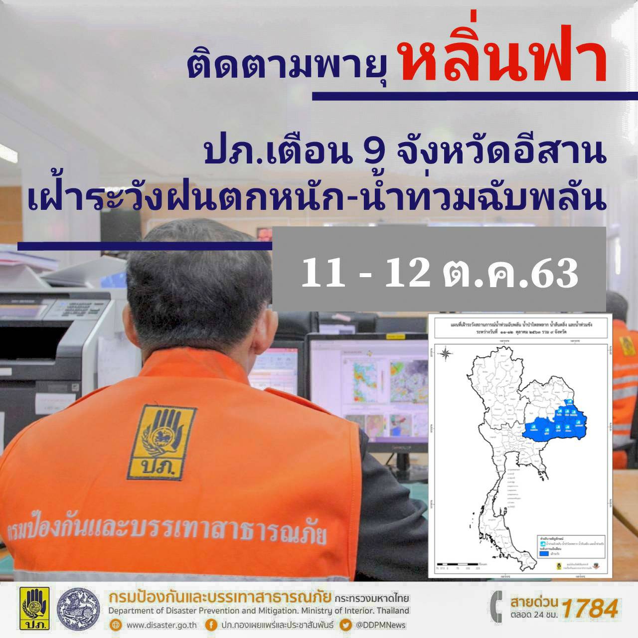 กทม. 11 ต.ค. -กอปภ.ก. ประสาน 9 จังหวัดภาคตะวันออกเฉียงเหนือ เฝ้าระวังน้ำท่วมฉับพลันจากอิทธิพลพายุ “หลิ่นฟา” ในวันที่ 11 – 12 ต.ค.63