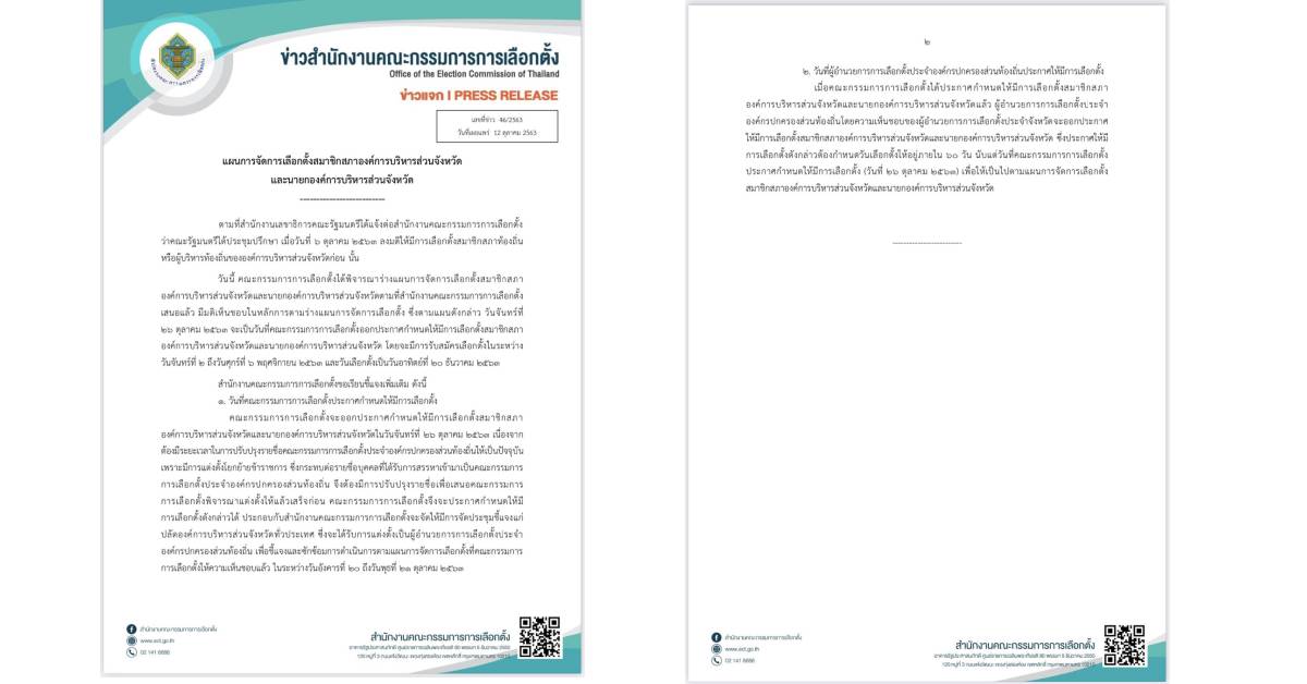 วันนี้ (12 ต.ค.) สำนักงาน กกต.ชี้แจงว่าหลังสำนักงานเลขาธิการคณะรัฐมนตรีได้แจ้งต่อสำนักงานกกต. ว่าคณะรัฐมนตรี เมื่อวันที่ 6 ต.ค. มีมติให้มีการเลือกตั้งสมาชิกสภาท้องถิ่น หรือผู้บริหารท้องถิ่นขององค์การบริหารส่วนจังหวัด (อบจ.) ก่อนที่ประชุม กกต.ได้พิจารณาร่างแผนการจัดการเลือกตั้งสมาชิกและนายก อบจ. ตามที่สำนักงาน กกต.เสนอและมีมติเห็นชอบในหลักการโดยในวันจันทร์ที่ 26 ต.ค. จะเป็นวันที่ กกต.ออกประกาศกำหนดให้มีการเลือกตั้งสมาชิกและนายก อบจ. โดยให้รับสมัครในวันที่ 2-6 พ.ย. และเลือกตั้งในวันอาทิตย์ที่ 20 ธ.ค.