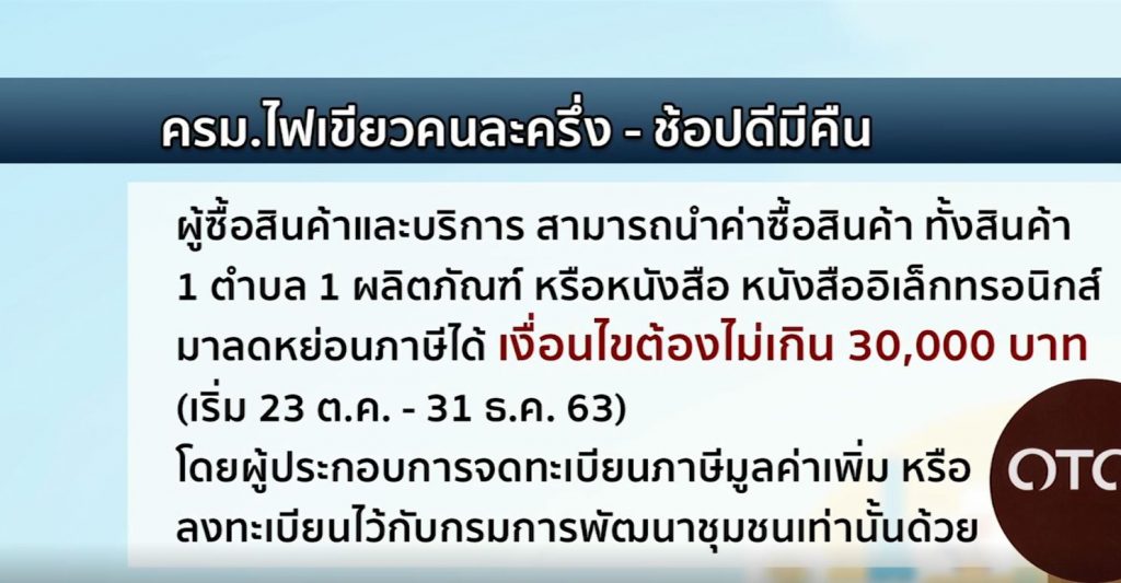 มาตรการช้อปดีมีคืน เน้นช่วยเหลือผู้ประกอบการ รวมถึงการส่งเสริมการผลิตสินค้าท้องถิ่นและส่งเสริมการอ่าน โดยผู้ซื้อสินค้าและบริการ สามารถนำค่าซื้อสินค้า ทั้งสินค้า 1 ตำบล 1 ผลิตภัณฑ์ หรือหนังสือเป็นเล่มๆ หนังสืออิเล็กทรอนิกส์ มาใช้หักลดหย่อนภาษีได้แต่มีเงื่อนไขว่า ต้องไม่เกิน 30,000 บาท และซื้อตั้งแต่วันที่ 23 ตุลาคม ถึง 31 ธันวาคมปีนี้ นอกจากนี้สินค้าและบริการต้องซื้อกับผู้ประกอบการจดทะเบียนภาษีมูลค่าเพิ่ม หรือลงทะเบียนไว้กับกรมการพัฒนาชุมชนเท่านั้นด้วย ขณะเดียวกันมีอีกเรื่องที่ต้องจำ คือ คนที่มีสิทธิ์ใช้มาตรการ ช้อปดีมีคืน ต้องไม่ได้รับสิทธิ์ตามโครงการคนละครึ่ง หรือโครงการเพิ่มกำลังซื้อให้แก่ผู้มีบัตรสวัสดิการแห่งรัฐ