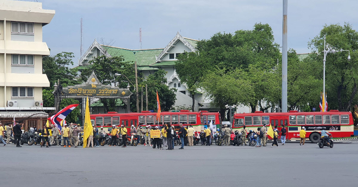 ส่วนที่บริเวณสะพานผ่านฟ้าลีสาศ ถนนราชดำเนินกลาง เจ้าหน้าที่ตำรวจได้นำรถประจำทางมาปิดถนน และแบริเออร์ เพื่อไม่ให้มีการใช้เส้นทาง .- สำนักข่าวไทย