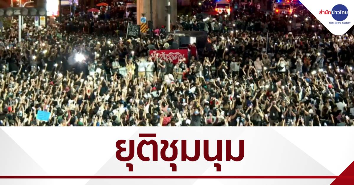 กรุงเทพฯ 15 ต.ค.-แกนนำคณะราษฎร ประกาศยุติการชุมนุมที่แยกราชประสงค์เวลา 22.00 น. และนัดหมายใหม่พรุ่งนี้ เวลา 17.00 น. มวลชนทยอยเดินทางกลับบ้านท่ามกลางสายฝนโปรยปราย.-สำนักข่าวไทย