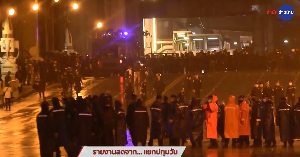 แยกปทุมวัน 16 ต.ค. – กลุ่มผู้ชุมนุมบริเวณแยกปทุมวันได้ถอยร่นไปแล้ว หลังเจ้าหน้าที่เข้ากระชับพื้นที่และฉีดน้ำแรงดันสูงใส่กลุ่มผู้ชุมนุม ล่าสุดเจ้าหน้าที่รุกคืบเข้าควบคุมพื้นที่บริเวณแยกปทุมวันได้สำเร็จ โดยประกาศให้ผู้ชุมนุมทุกคนแยกย้ายกันกลับบ้าน. – สำนักข่าวไทย