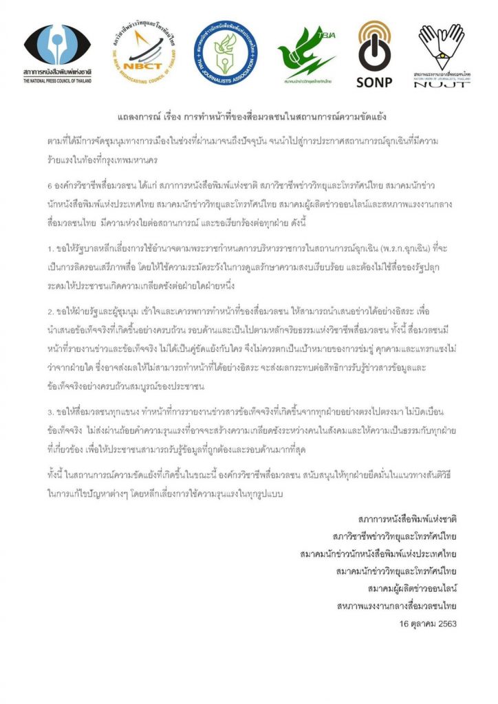 - ขอให้ฝ่ายรัฐและผู้ชุมนุม เข้าใจและเคารพการทำหน้าที่ของสื่อมวลชน ให้สามารถนำเสนอข่าวได้อย่างอิสระ เพื่อนำเสนอข้อเท็จจริงที่เกิดขึ้นอย่างครบถ้วน รอบด้านและเป็นไปตามหลักจริยธรรมแห่งวิชาชีพสื่อมวลชน ทั้งนี้ สื่อมวลชนมีหน้าที่รายงานข่าวและข้อเท็จจริง ไม่ได้เป็นคู่ขัดแย้งกับใคร จึงไม่ควรตกเป็นเป้าหมายของการข่มขู่ คุกคามและแทรกแซงไม่ว่าจากฝ่ายใด ซึ่งอาจส่งผลให้ไม่สามารถทำหน้าที่ได้อย่างอิสระ จะส่งผลกระทบต่อสิทธิการรับรู้ข่าวสารข้อมูลและข้อเท็จจริงอย่างครบถ้วนสมบูรณ์ของประชาชน