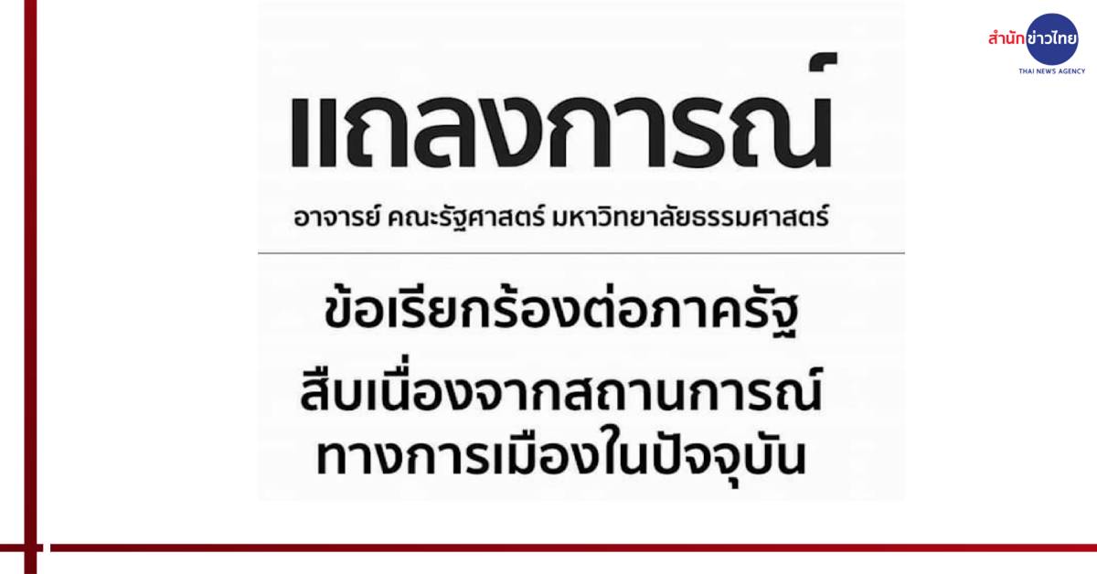 อาจารย์ประจำคณะรัฐศาสตร์มหาวิทยาลัยธรรมศาสตร์ ออกแถลงการณ์ข้อเรียกร้องต่อภาครัฐ เนื้อหาระบุว่าหลังจากที่รัฐบาลได้ประกาศสถานการณ์ฉุกเฉินที่มีความร้ายแรงในเขตกรุงเทพมหานคร และดำเนินการกสลายการชุมนุมที่แยกปทุมวันเมื่อคืนที่ผ่านมา อาจารย์คณะรัฐศาสตร์ มหาวิทยาลัยธรรมศาสตร์ จำนวน 25 คน ขอเรียกร้องให้เจ้าหน้าที่รัฐที่เกี่ยวข้องปฏิบัติต่อประชาชนผู้ชุมนุมโดยสันติวิธีตามกติการะหว่างประเทศว่าด้วยสิทธิพลเมืองและสิทธิทางการเมือง ไม่สร้างเงื่อนไขที่อาจนำไปสู่ความรุนแรง ขณะที่ทางรัฐบาลจำเป็นต้องเร่งพิจารณาทบทวนท่าทีและแนวทางสื่อสารกับสังคมในปัจจุบัน ดูแลความปลอดภัยของประชาชนที่เข้าร่วมการชุมนุมอย่างเต็มที่ รวมทั้งเปิดการเจรจาพูดคุยอย่างสร้างสรรค์ผ่านพื้นที่สาธารณะที่ทุกภาคส่วนสามารถเข้าร่วมแสดงความคิดเห็นได้อย่างสันติและปลอดภัย เพื่อหาทางออกจากวิกฤติโดยไม่มีความรุนแรงและความสูญเสียเกิดขึ้น.-สำนักข่าวไทย