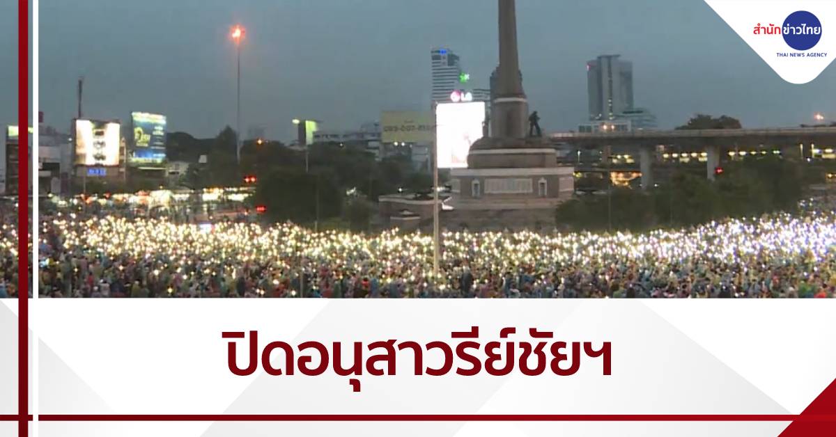 กทม. 18 ต.ค.-การชุมนุมที่อนุสาวรีย์ชัยสมรภูมิ ตั้งแต่เริ่มต้นจนถึงช่วงค่ำ ผู้ชุมนุมเต็มพื้นที่ ตั้งแต่บริเวณเกาะดินแดง อ้อมไปเกาะราชวิถี มีการเปิดช่องทางเป็นระยะๆ ให้รถพยาบาล หรือรถฉุกเฉิน วิ่งผ่านไปได้โดยสะดวก ขณะที่การจราจรปิดโดยปริยายทุกด้าน แกนนำขึ้นปราศรัยย้ำ 3 ข้อเรียกร้อง ก่อนผู้ชุมนุมจะพร้อมใจเปิดแฟลชมือถือพร้อมกัน และประกาศยุติการชุมนุมในเวลา 20.00 น. หากสถานการณ์ไม่เปลี่ยนแปลง.-สำนักข่าวไทย