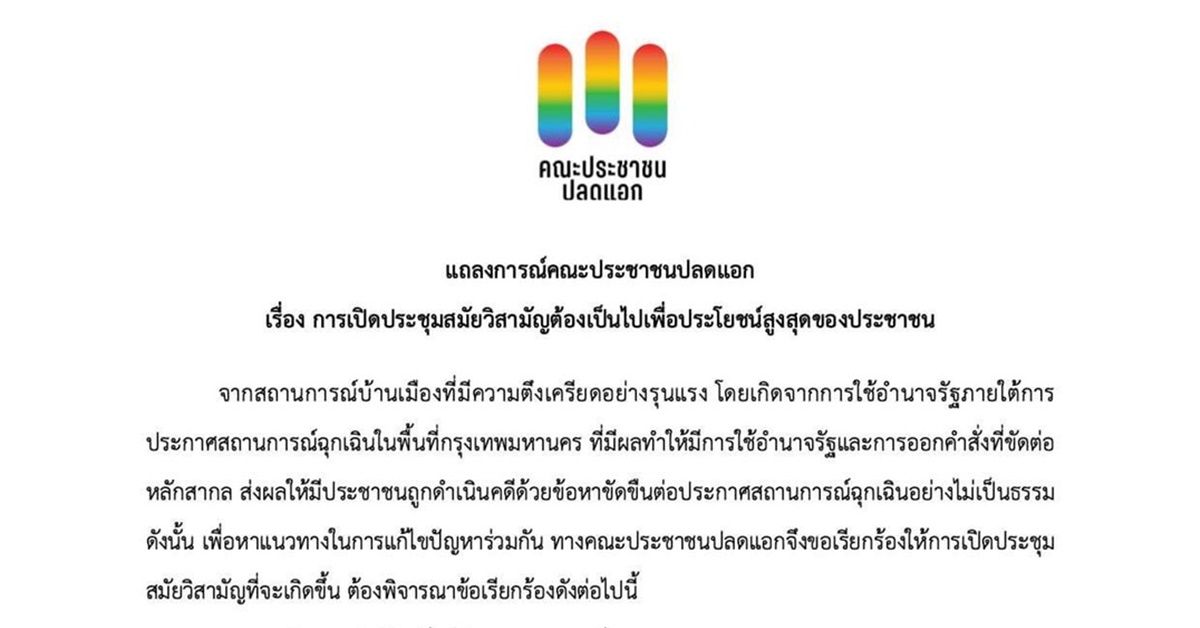 ดังนั้น เพื่อหาแนวทางในการแก้ไขปัญหาร่วมกัน ทางคณะประชาชนปลดแอกจึงขอเรียกร้องให้เปิดประชุมสมัยวิสามัญที่จะเกิดขึ้น ต้องพิจารณาข้อเรียกร้องดังต่อไปนี้