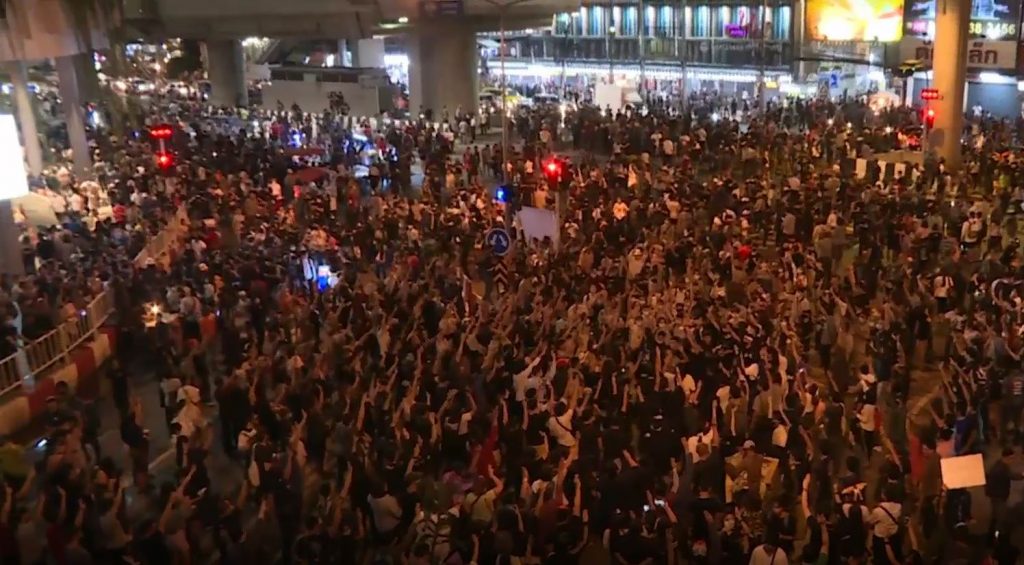 จากนั้นแนวร่วมผู้ชุมนุมได้ใช้ลำโพงเคลื่อนที่พูดปราศรัย และโบกธงไปมา ผลัดกันพูดกับมวลชนประกาศข้อเรียกร้อง 3 ข้อ และจัดกิจกรรมร้องเพลง เปิดแสงไฟจากมือถือเชิงสัญลักษณ์