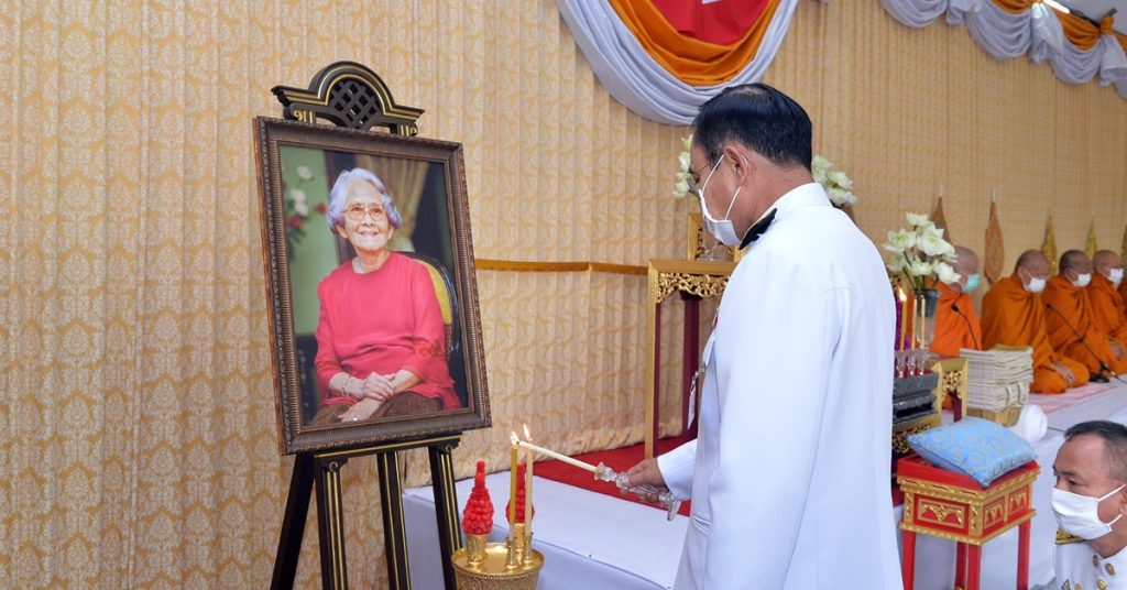 นายกรัฐมนตรีและภริยา จุดธูปเทียนบูชาพระรัตนตรัย จุดธูปเทียนเครื่องทองน้อยหน้าพระบรมฉายาลักษณ์สมเด็จพระศรีนครินทราบรมราชชนนี สมเด็จพระราชาคณะ พระราชาคณะและพระสงฆ์ในพิธีเจริญพระพุทธมนต์ นายกรัฐมนตรีและภริยา คณะรัฐมนตรี ประธานรัฐสภา ประธานศาลฎีกา ถวายเครื่องไทยธรรม นายกรัฐมนตรีถวายผ้าไตร จำนวน 10 ไตร พระสงฆ์สดับปกรณ์ พระสงฆ์อนุโมทนา ถวายอดิเรก นายกรัฐมนตรีกรวดน้ำรับพร