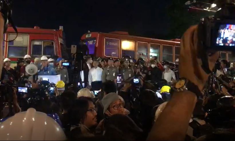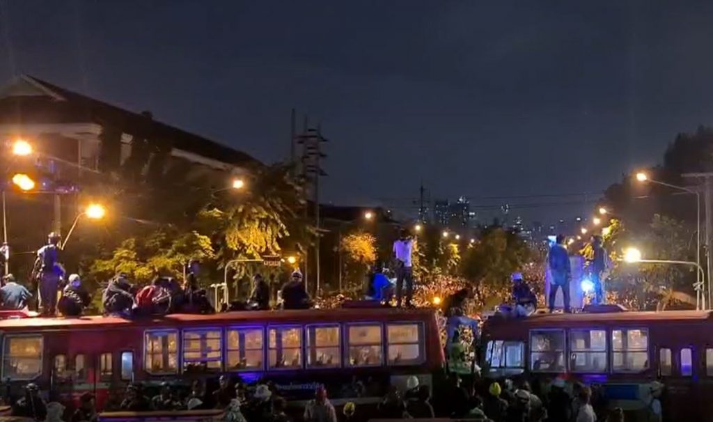 เวลา 21.00 น. กลุ่มผู้ชุมนุมพูดคุยกับเจ้าหน้าที่พยายามผลักดันขอให้โชเฟอร์ขับรถเมล์ เคลื่อนย้ายรถเมล์โดยสาร จำนวน 7 คัน ออกจากพื้นที่ เพื่อความปลอดภัยหลังพบมีกลุ่มควบคุมฝูง 2-3 คนนั่งอยู่บนรถเมล์ดังกล่าว เมื่อมีการเจรจาพูดคุยกันเจ้าหน้าจึงให้รถเมล์วิ่งทั้งหมดออกจากบริเวณดังกล่าวไป