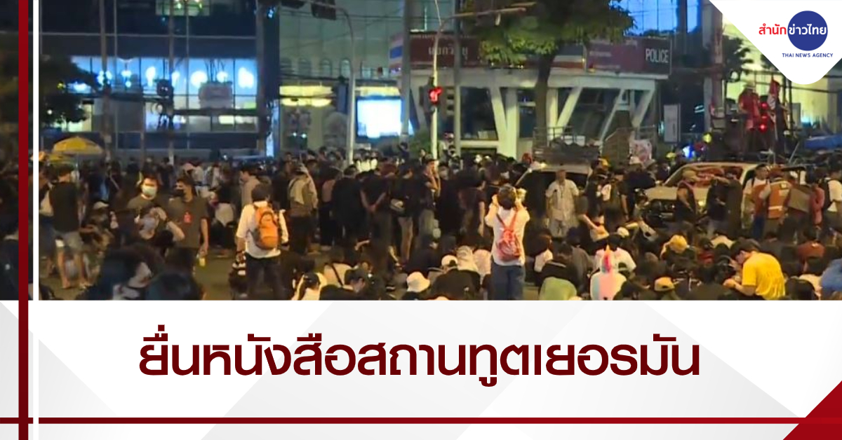 การชุมนุมของกลุ่มคณะราษฎร 63 ที่มีการเคลื่อนขบวนจากแยกสามย่าน มุ่งหน้ามายังสถานทูตเยอรมัน ล่าสุดกลุ่มผู้ชุมนุมได้ยื่นหนังสือถึงสถานทูตเยอรมันเป็นที่เรียบร้อยแล้ว รวมถึงมีการอ่านแถลงการณ์ประกาศจุดยืนหน้าสถานทูตฯ ด้วย และจนถึงขณะนี้การชุมนุมยังคงดำเนินไปอย่างต่อเนื่อง โดยผู้ชุมนุมยังคงปักหลักอยู่ที่บริเวณ ถ.สาทรใต้ ทั้งฝั่งขาเข้าและขาออก ยาวต่อเนื่องจนถึงแยกวิทยุ. – สำนักข่าวไทย