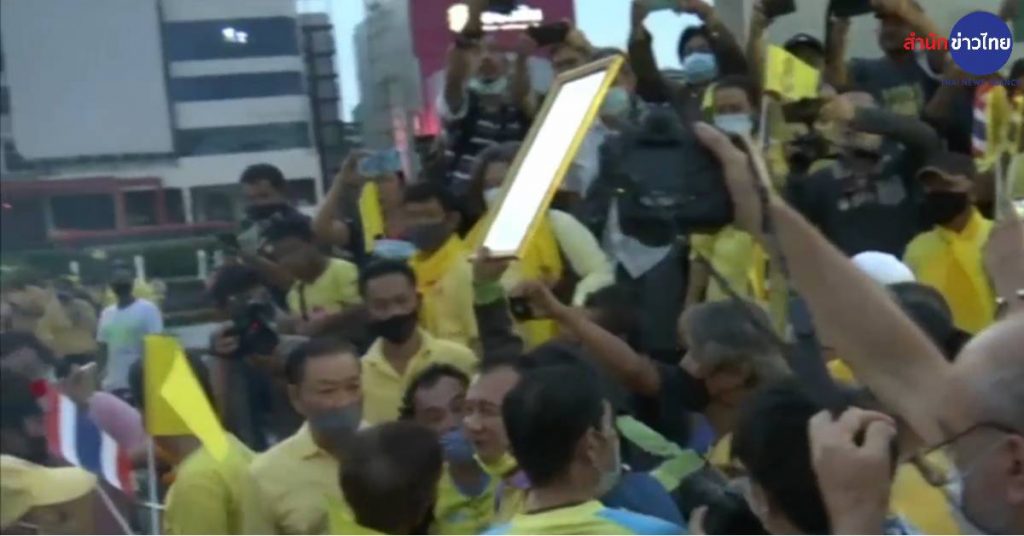 วงเวียนใหญ่ 28 ต.ค.-กลุ่มปกป้องสถาบันรวมตัวแสดงพลังร้องเพลงชาติวงเวียนใหญ่ ชายวันกลางคนแฝงตัวเข้าร่วมชู 3 นิ้ว หวิดถูกรุม