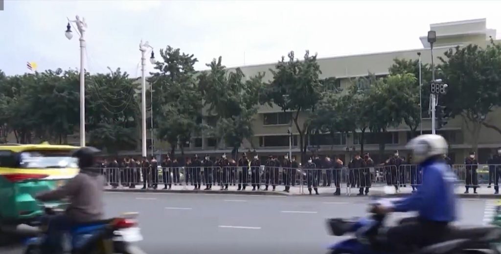 ขณะที่เจ้าหน้าที่ตำรวจได้นำรั้วเหล็กแผงกั้นตั้งแนวเป็นเกาะกลางถนนราชดำเนินกลาง มุ่งหน้าสะพานผ่านพิภพลีลา ขณะที่การจราจรในพื้นที่ยังคงสามารถสัญจรได้ตามปกติ โดยมีเจ้าหน้าที่ตำรวจคอยอำนวยความสะดวกอย่างต่อเนื่อง