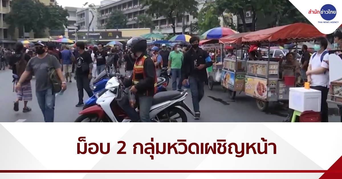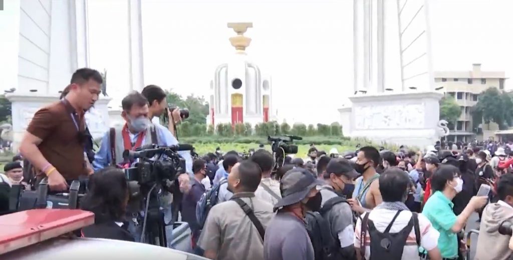 ขณะที่ตำรวจควบคุมฝูงชนตรึงกำลังและนำรั้วเหล็กแผงกั้นตั้งแนวเป็นเกาะกลางถนนราชดำเนิน เพื่อคั่นตรงกลางระหว่างมวลชนทั้งสองกลุ่ม