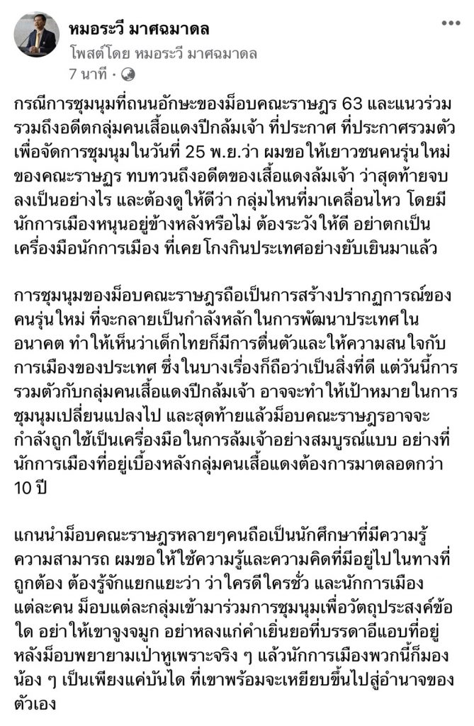 นพ.ระวี มาศฉมาดล ส.ส.บัญชีรายชื่อ พรรคพลังธรรมใหม่ กล่าวถึงกรณีการชุมนุมที่ถนนอักษะของม็อบคณะราษฎร 63 และแนวร่วม รวมถึงกลุ่มคนเสื้อแดง ที่ประกาศรวมตัวเพื่อจัดการชุมนุมวันพรุ่งนี้(25 พ.ย.) ว่า ขอให้เยาวชนคนรุ่นใหม่ของคณะราษฏรทบทวนถึงอดีตของเสื้อแดงล้มเจ้า ว่าสุดท้ายจบลงอย่างไร และต้องดูให้ดีว่ากลุ่มไหนที่มาเคลื่อนไหวเป็นกลุ่มเสื้อแดงที่ไม่ล้มเจ้าหรือกลุ่มเสื้อแดงที่ล้มเจ้า โดยมีนักการเมืองหนุนอยู่ข้างหลังหรือไม่ ต้องระวังให้ดี อย่าตกเป็นเครื่องมือนักการเมืองที่เคยโกงกินประเทศอย่างยับเยินมาแล้ว