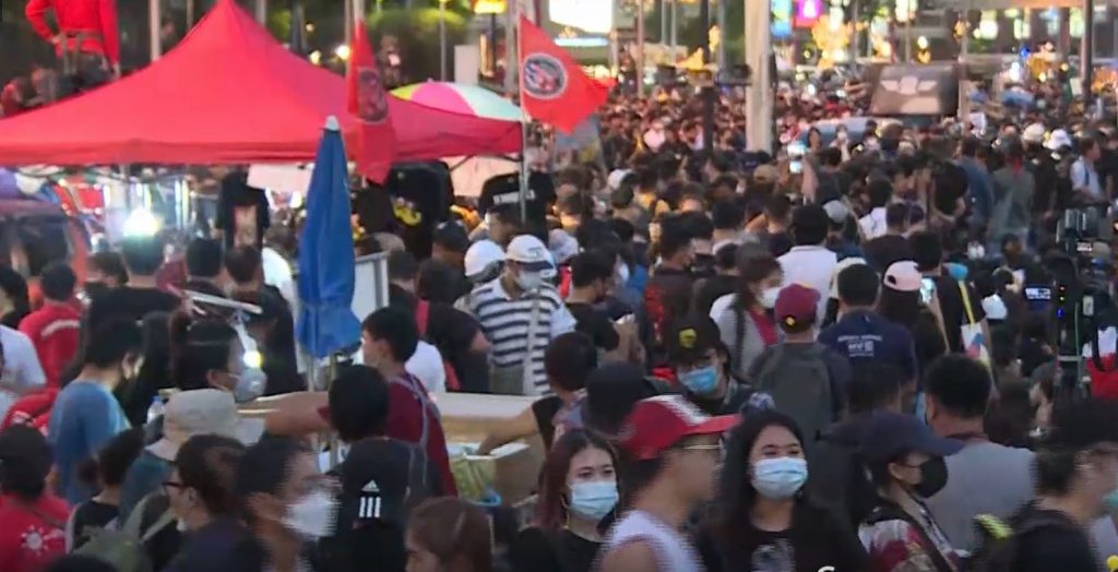 ขณะที่บรรยากาศการชุมนุมก่อนหน้านี้แกนนำได้ให้ผู้ชุมนุมขึ้นไปนั่งอยู่บริเวณสวนสาธารณะ ซึ่งประชิดกับแนวรั้วของเจ้าหน้าที่ตำรวจที่มาดูแลรักษาความปลอดภัยหน้าธนาคาร แต่จนถึงขณะนี้ยังไม่มีการประกาศให้มวลชนบุกเข้าไปภายในพื้นที่ของธนาคารแต่อย่างใดขณะเดียวกันได้มีการนำเอาป้ายผ้าที่มีข้อความเกี่ยวกับการใช้งบประมาณของสถาบันขนาดใหญ่หลายสิบๆ มาติดบริเวณโดยรอบพื้นที่ด้วย นอกจากนี้จะนำยังขอให้การ์ดของกลุ่มผู้ชุมนุมทำการปิดถนนรัชดาภิเษกทั้งฝั่งขาเข้าและขาออกตั้งแต่แยกรัชโยธิน เพื่อขยายพื้นที่การชุมนุมแต่ยังคงให้รถสัญจรไปมาผ่านทางอุโมงค์ทางลอดได้ ขณะนี้ยังไม่มีการประกาศชัดเจนว่าการชุมนุมวันนี้จะยุติลงในเวลาใด.-สำนักข่าวไทย