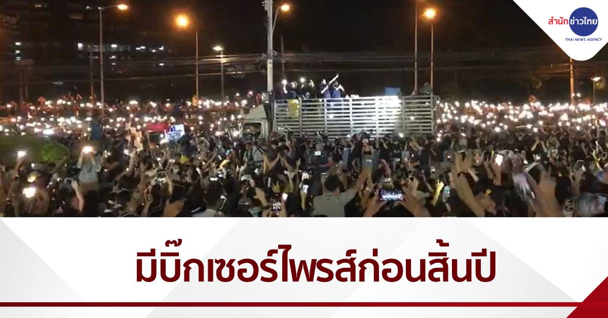 เวลา 20.30น. นายชินวัตร จันทร์กระจ่าง หรือไบร์ท แกนนำคณะราษฎร ขึ้นปราศรัยอีกครั้งว่า อีกไม่นานเราจะฉลองปีใหม่ด้วยชัยชนะของราษฎร เร็วๆ นี้ พี่น้องจะมีบิ๊กเซอร์ไพรส์แบบเบิ้มๆ อย่างแน่นอน ยืนยันเราจะต่อสู้แบบสนุก สันติ อหิงสา พร้อมขอให้พี่น้องผู้ร่วมชุมนุมร่วมปฏิญาณตนจะไม่ทอดทิ้งกัน จะต่อสู้เคียงบ่าเคียงไหล่กันจนกว่าจะได้รับชัยชนะ จากนั้นกลุ่มผู้ชุมนุมทั้งหมดได้ช่วยกันเปิดแสงไฟมือถือ และร้องเพลง “เสมอ” ของปู พงษ์สิทธิ์ คำภีร์ และร่วมกันโห่ร้องสร้างกำลังใจในการต่อสู้เรียกร้อง