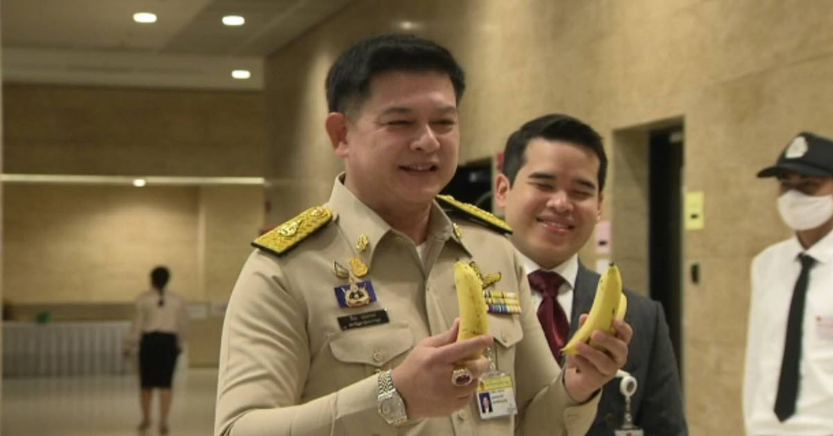 รัฐสภา 26 พ.ย.- นายสิระ เจนจาคะ ส.ส.กรุงเทพฯ พรรคพลังประชารัฐ นำกล้วยหอมจำนวน 3 ลูก มาให้กับนายมงคลกิตติ์ สุขสินธรานนท์ ส.ส.บัญชีรายชื่อ พรรคไทยศรีวิไลย์ หลังจากที่นายมงคลกิตติ์ ไลฟ์เฟซบุ๊ค ประกาศถอนตัวจากการเป็นพรรคร่วมรัฐบาล ไปทำหน้าที่ฝ่ายค้านอิสระ พร้อมระบุว่า ยังไม่แน่ใจว่านายมงคลกิตติ์ลาออกเอง หรือถูกบังคับให้ลาออก