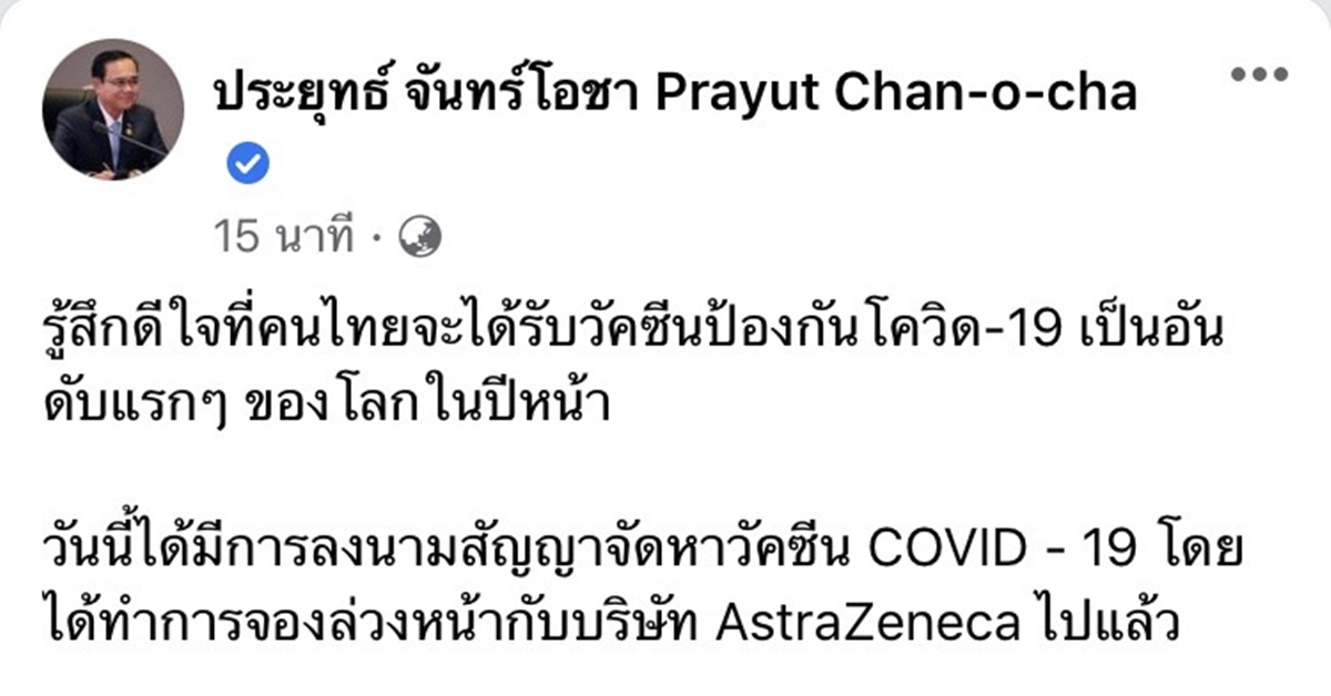“ดีใจที่คนไทยจะได้รับวัคซีนป้องกันโควิด-19 เป็นอันดับแรก ๆ ของโลกในปีหน้า วันนี้ได้มีการลงนามสัญญาจัดหาวัคซีน COVID – 19 โดยได้ทำการจองล่วงหน้ากับบริษัท AstraZeneca ไปแล้ว ขอให้พวกเราทุกคนมั่นใจได้ว่า คนไทยจะต้องเข้าถึงยา เข้าถึงการรักษา ได้อย่างรวดเร็วและทั่วถึง”