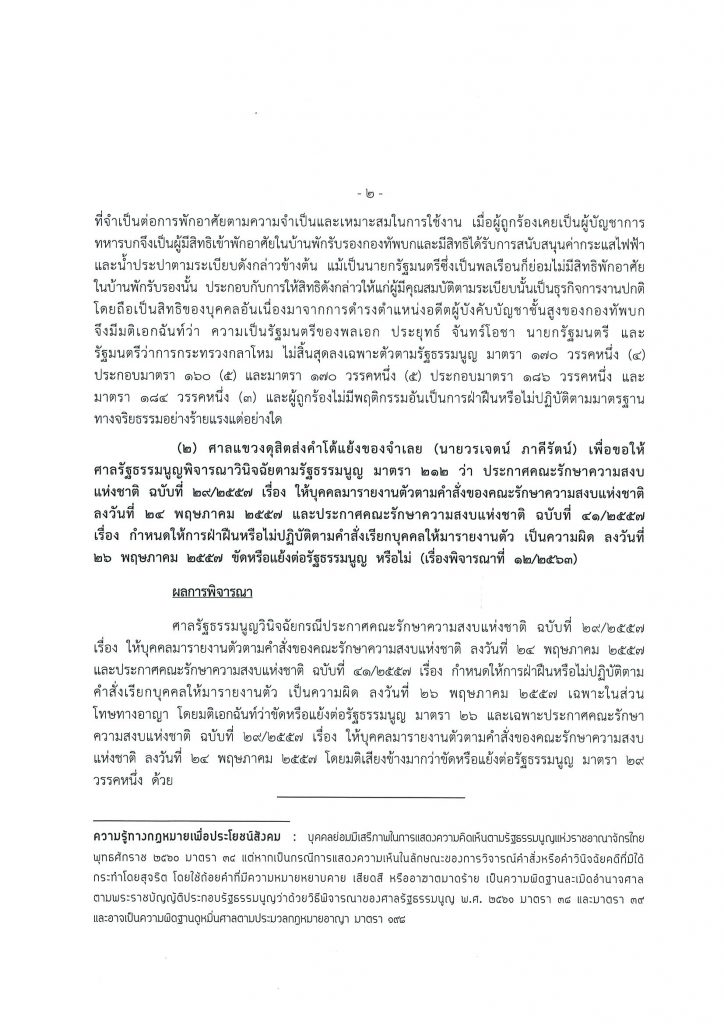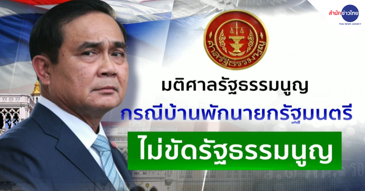 กทม. 2 ธ.ค. – ตุลาการศาลรัฐธรรมนูญวินิจฉัยคุณสมบัติของ พล.อ.ประยุทธ์ จันทร์โอชา นายกรัฐมนตรี ไม่ขัดต่อรัฐธรรมนูญ และไม่มีผลประโยชน์อื่นใด กรณีพักบ้านหลวง