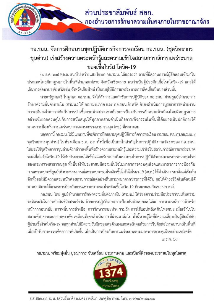 “กอ.รมน.มีแผนงานจะจัดการฝึกอบรมชุดปฏิบัติการกิจการพลเรือน กอ.รมน. (ชป.กร.กอ.รมน. ชุดวิทยากรขุนด่าน) ในห้วงเดือนธันวาคมนี้ เพื่อเป็นกลไกสำคัญในการปฏิบัติงานเชิงรุกของกอ.รมน. โดยจะใช้ชุดวิทยากรขุนด่านลงพื้นที่สร้างความตระหนักรู้และความเข้าใจในสถานการณ์การแพร่ระบาดของเชื้อไวรัสโควิด-19 ให้ประชาชนเข้าใจและรับทราบแนวทางการปฏิบัติตัวตามมาตรการควบคุมโรคของกระทรวงสาธารณสุข ทั้งนี้ขอให้ประชาชนมีความมั่นใจในมาตรการควบคุมโรคและมาตรการการป้องกันการแพร่ระบาดที่ศูนย์บริหารสถานการณ์แพร่ระบาดของโรคติดเชื้อไวรัสโคโรนา-19 (ศบค.) ได้ดำเนินการมาตั้งแต่เริ่มต้น อีกทั้งขอให้ตระหนักต่อสถานการณ์ แต่อย่างตื่นตระหนกจากข่าวสารที่ได้รับ ขอให้ดำรงชีวิตในสังคมได้ตามปกติภายใต้มาตรการป้องกันการแพร่ระบาดของโรคติดเชื้อโควิด-19 ที่เหมาะสมกับสถานการณ์” โฆษก กอ.รมน. กล่าว