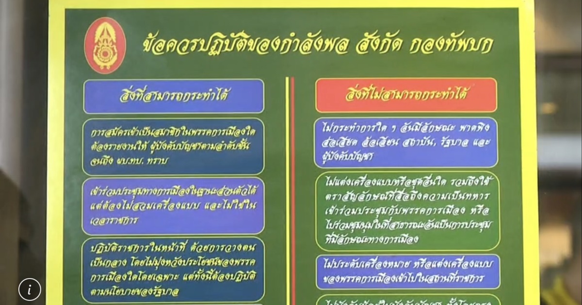 โดยกองทัพบกได้ทำโปสเตอร์ติดภายในพื้นที่ บก.ทบ. ระบุสิ่งที่สามารถทำได้ดังนี้ ประกอบด้วย การสมัครเข้าเป็นสมาชิกในพรรคการเมืองใดนั้น ต้องรายงานให้ผู้บังคับบัญชาตามลำดับชั้นจนถึงผู้บัญชาการทหารบกทราบ และการเข้าร่วมประชุมทางการเมืองในฐานะส่วนตัวนั้นสามารถทำได้ แต่ต้องไม่สวมเครื่องแบบและไม่ใช่ในเวลาราชการ ขณะที่การปฏิบัติราชการในหน้าที่ต้องวางตนเป็นกลาง ไม่มุ่งหวังประโยชน์ของพรรคการเมืองใดโดยเฉพาะ แต่ทั้งนี้ต้องปฏิบัติตามนโยบายของรัฐบาล ส่วนการลงคะแนนเสียง การแสดงความคิดเห็นส่วนตัวต่อผู้ลงสมัครนั้นสามารถทำได้ เช่นเดียวกับ การแสดงความคิดเห็นทางการเมืองสามารถกระทำได้โดยไม่แต่งเครื่องแบบและไม่ใช้เวลาราชการ ในการเข้าร่วมประชุมในที่สาธารณะนั้นต้องเป็นไปอย่างสงบ