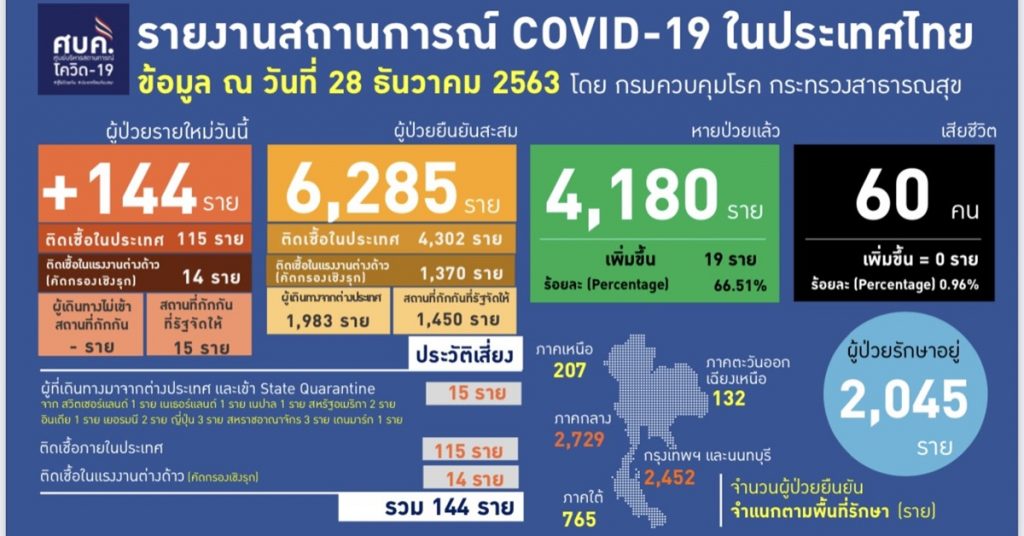 ทำเนียบฯ 28 ธ.ค.- ศบค.พบป่วยโควิดเพิ่ม144ราย แบ่งเป็นในประเทศ115คน ผู้ว่าฯสมุทรสาครติดเชื้อด้วย เน้นย้ำ สมุทรสาคร และระยองเป็นพื้นที่ควบคุมสูงสุด
