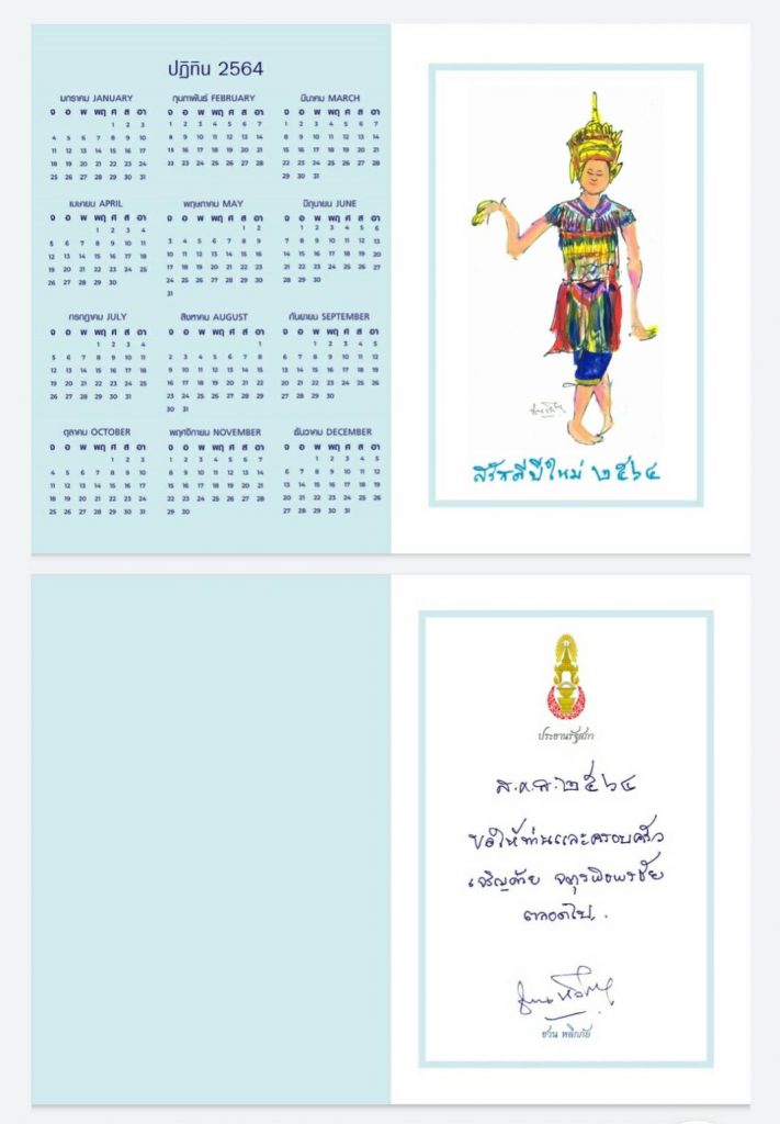 ประธานรัฐสภา ยังได้มอบ ส.ค.ส. ที่วาดรูป นางมโนราห์ ซึ่งเป็นศิลปะการแสดงพื้นเมืองของภาคใต้ เพื่ออวยพรส่งความสุขให้ประชาชน และเจริญด้วยจตุรพิธพรชัยตลอดไปด้วย .-สำนักข่าวไทย