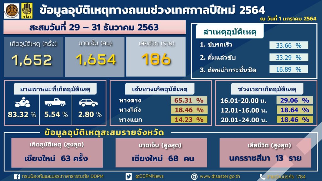 สำหรับสรุปอุบัติเหตุทางถนนสะสมในช่วง 3 วันของการรณรงค์ (29 – 31 ธ.ค.63) เกิดอุบัติเหตุรวม 1,652 ครั้ง ผู้เสียชีวิตรวม 186 ราย ผู้บาดเจ็บ รวม 1,654 คน จังหวัดที่ไม่มีผู้เสียชีวิต (ตายเป็นศูนย์) มี 17 จังหวัด จังหวัดที่เกิดอุบัติเหตุสะสมสูงสุด ได้แก่ เชียงใหม่ 63 ครั้ง จังหวัดที่มีผู้เสียชีวิตสะสมสูงสุด ได้แก่ นครราชสีมา จังหวัดละ 13 ราย จังหวัดที่มีผู้บาดเจ็บสะสมสูงสุด ได้แก่ เชียงใหม่ 68 คน