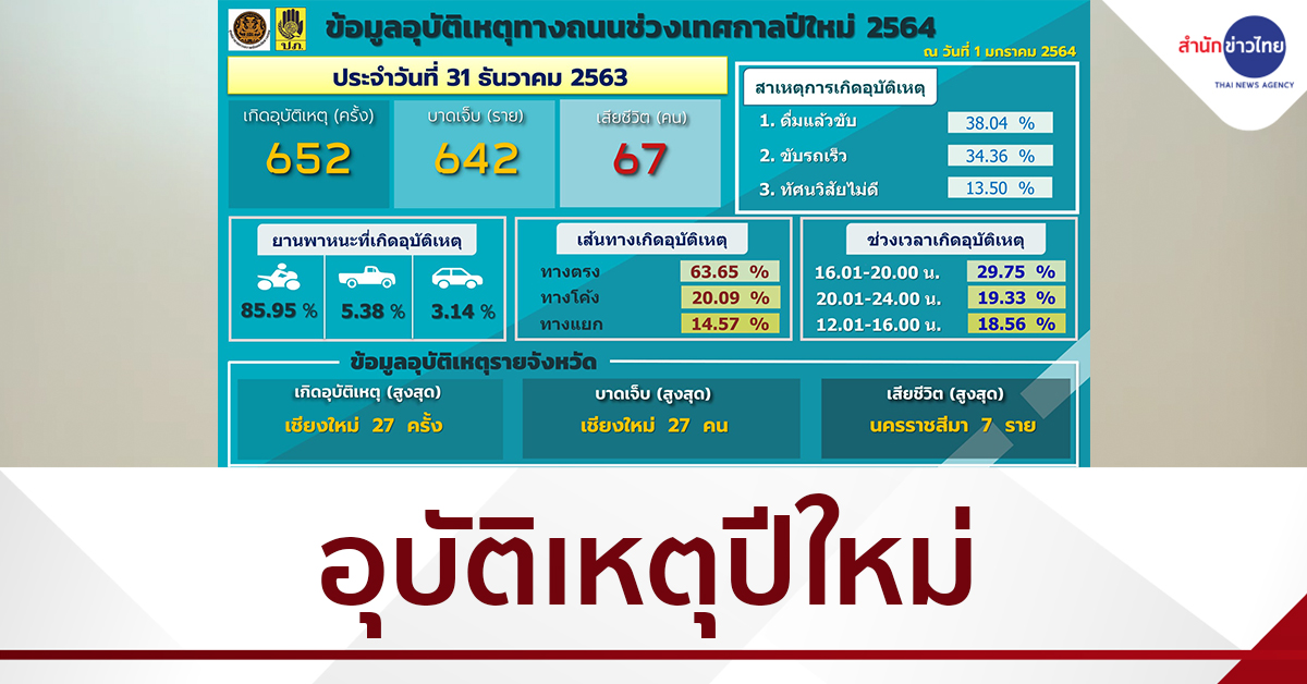 เมื่อเวลา 10.00 น. นพ.ขจรศักดิ์ แก้วจรัส รองอธิบดีกรมควบคุมโรค ในฐานะประธานแถลงข่าวสรุปผลการดำเนินงานป้องกันและลดอุบัติเหตุทางถนนช่วงเทศกาลปีใหม่ พ.ศ. 2564 แถลงว่า ศปถ. รวบรวมสถิติอุบัติเหตุทางถนนประจำวันที่ 31 ธันวาคม 2563 ซึ่งเป็นวันที่ 3 ของการรณรงค์ “ชีวิตวิถีใหม่ ขับขี่ปลอดภัย ไร้อุบัติเหตุ” เกิดอุบัติเหตุ 652 ครั้ง ผู้เสียชีวิต 67 ราย ผู้บาดเจ็บ 642 คน สาเหตุที่ทำให้เกิดอุบัติเหตุสูงสุด ได้แก่ ดื่มแล้วขับ ร้อยละ38.04 ขับรถเร็ว ร้อยละ 34.36 ยานพาหนะที่เกิดอุบัติเหตุสูงสุด ได้แก่ รถจักรยานยนต์ ร้อยละ 85.95 ส่วนใหญ่เกิดบนเส้นทางตรง 63.65ถนนกรมทางหลวง ร้อยละ 33.59 ถนนใน อบต./หมู่บ้าน ร้อยละ 38.04 ช่วงเวลาที่เกิดอุบัติเหตุสูงสุด ได้แก่ ช่วงเวลา 16.01 – 20.00 น. ร้อยละ 29.75 ผู้บาดเจ็บและเสียชีวิตสูงสุด อยู่ในช่วงอายุ 50 ปีขึ้นไป ร้อยละ 25.81 ทั้งนี้ ได้จัดตั้งจุดตรวจหลัก 1,914 จุด เจ้าหน้าที่ปฏิบัติงาน 61,613 คน เรียกตรวจยานพาหนะ 417,876 คัน มีผู้ถูกดำเนินคดี รวม 79,851 ราย มีความผิดฐานไม่สวมหมวกนิรภัย 23,295 ราย ไม่มีใบขับขี่ 19,877 ราย โดยจังหวัดที่เกิดอุบัติเหตุสูงสุด ได้แก่ เชียงใหม่ 27 ครั้ง , จังหวัดที่มีผู้เสียชีวิตสูงสุด ได้แก่ นครราชสีมา 7 ราย จังหวัดที่มีผู้บาดเจ็บสูงสุด ได้แก่ เชียงใหม่ 27 คน