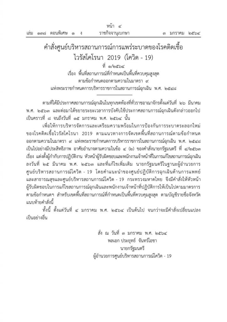 กรุงเทพฯ 3 ม.ค.-ราชกิจจาฯ ออก 8 มาตรการ ในพื้นที่สีแดง 28 จังหวัด มีผลวันที่ 4 ม.ค. เวลา 06.00 น. เป็นต้นไป หลัง ศบค. แถลงตัวเลขผู้ป่วยใหม่ในประเทศ พุ่ง 315 คน ใน 53 จังหวัด