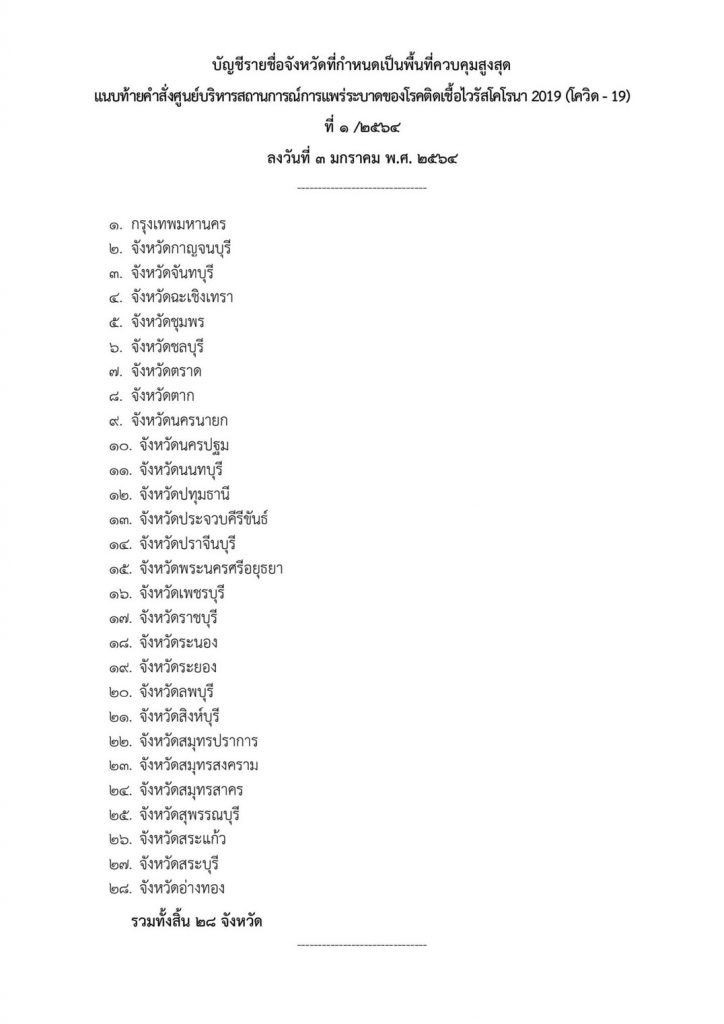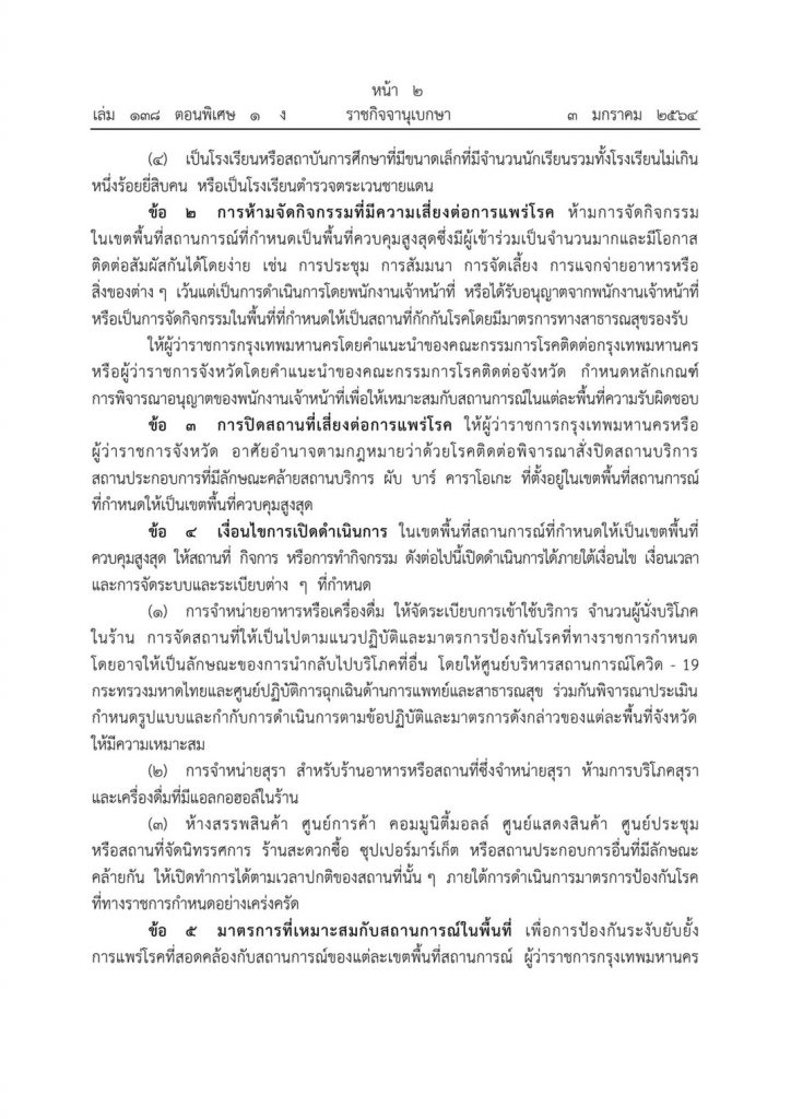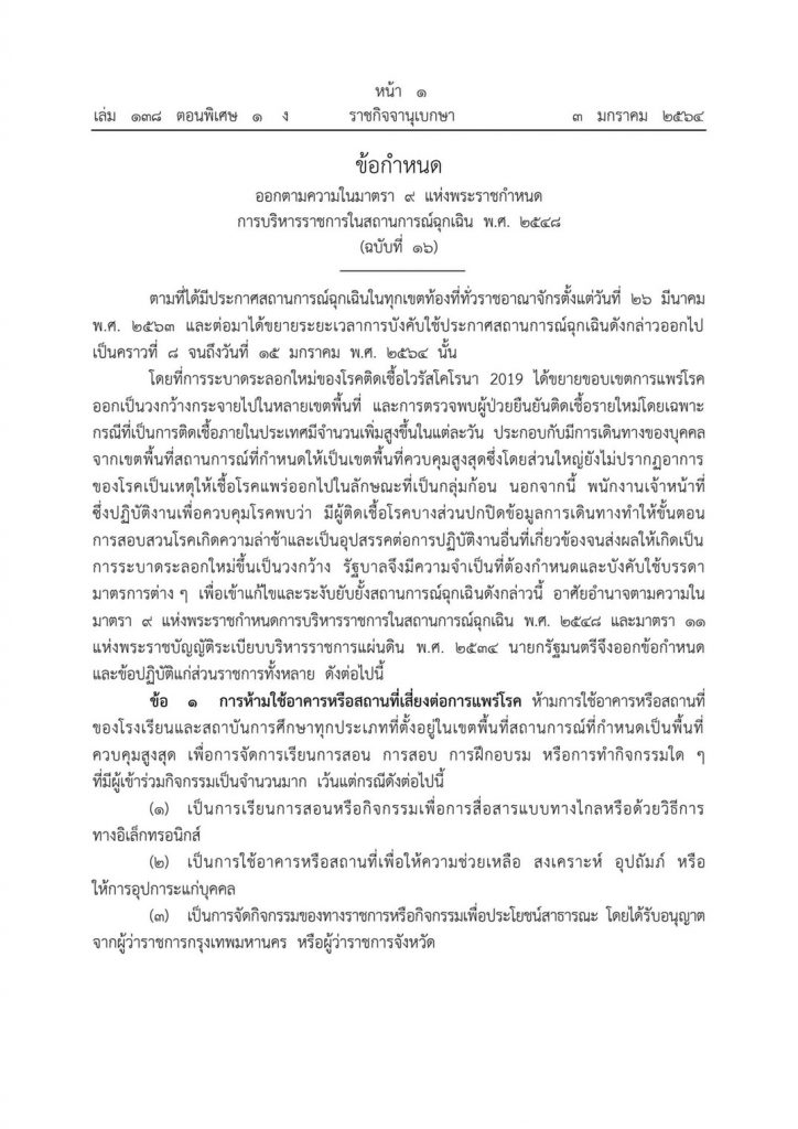 1.ห้ามใช้อาคารหรือสถานที่ที่เสี่ยงต่อการแพร่โรค หรือห้ามใช้อาคารและสถานที่ของสถาบันการศึกษาทุกประเภทในพื้นที่ควบคุมสูงสุด หรือพื้นที่สีแดง 28 จังหวัด
