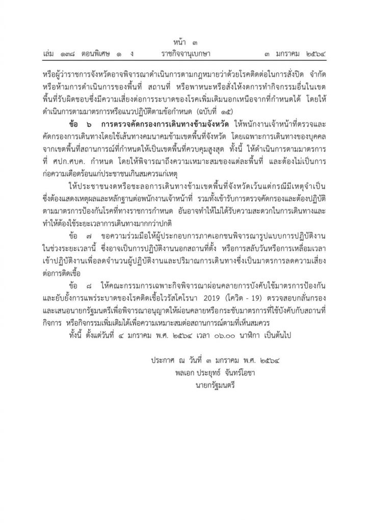 นอกจากนี้ โฆษก ศบค.ยังเปิดเผยร่างประกาศมาตรการฉบับที่ 6 ของ ศบค. ก่อนจะนำเสนอให้นายกรัฐมนตรีในฐานะ ผอ.ศบค.ลงนาม โดยบอกว่า การหารือกันระหว่าง ศบค. ชุดเล็กกับกระทรวงสาธารณสุข เห็นว่าพื้นที่สีแดง 28 จังหวัด ที่มีการประกาศให้เป็นพื้นที่ควบคุมสูงสุด ควรปรับแก้ในบางเรื่อง เนื่องจากสถานการณ์ในแต่ละจังหวัดแตกต่างกันไป โดยล่าสุดราชกิจจานุเบกษา ออกประกาศ 8 ข้อ ในเว็บไซต์แล้ว มีผลบังคับใช้เวลา 06.00 น. วันพรุ่งนี้ (4 ม.ค.)