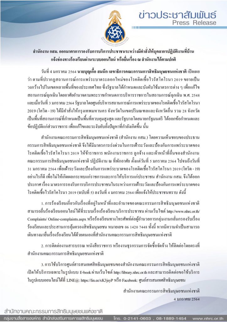 “สำนักงาน กสม.ออกประกาศเรื่อง มาตรการรองรับการบริการประชาชนในระหว่างการเฝ้าระวังและป้องกันการแพร่ระบาดของโรคโควิด-19 โดยประชาชนที่ต้องการร้องเรียนเกี่ยวกับเรื่องที่อยู่ในหน้าที่และอำนาจของกสม. สามารถยื่นร้องเรียนออนไลน์ได้ที่ระบบเรื่องร้องเรียน/บริการประชาชน ผ่านเว็บไซต์ http://www.nhrc.or.th/Complaints/ Online-complaints.aspx หรือร้องเรียนทางโทรศัพท์ต่อผู้อำนวยการกลุ่มงานกลั่นกรองรับเรื่องร้องเรียนและประสานการคุ้มครองสิทธิมนุษยชน หมายเลข 06 1420 7448 และหากมีความจำเป็นสามารถเดินทางมายื่นเรื่องร้องเรียนได้ด้วยตนเองที่สำนักงานกสม.” เลขาธิการกสม. กล่าว
