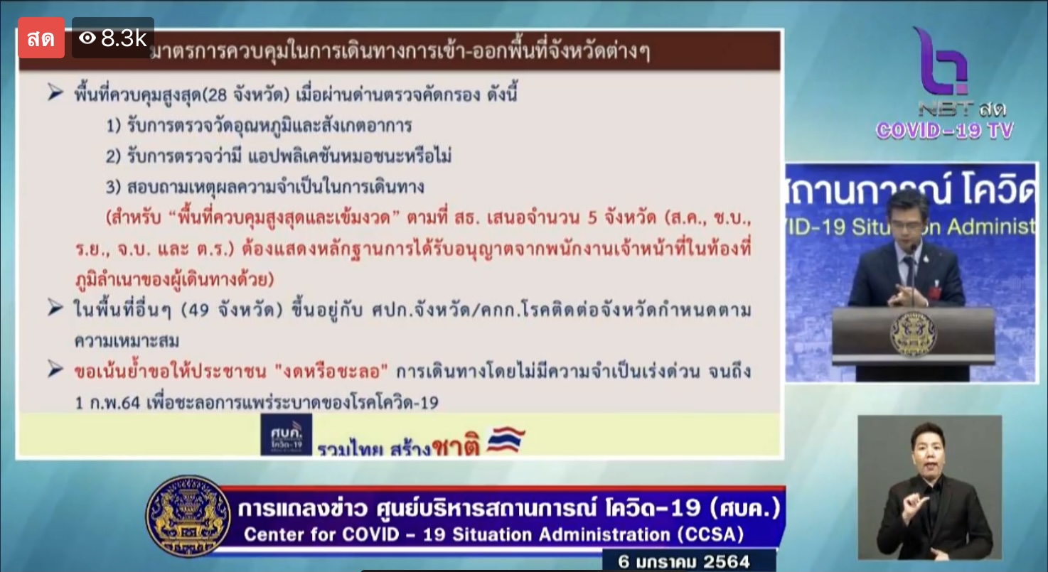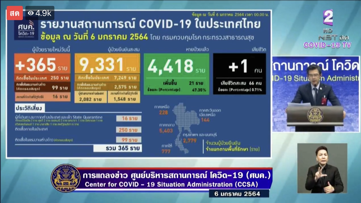 ทำเนียบ 6 ม.ค.- ยอดติดเชื้อโควิดเพิ่ม 365 คน เสียชีวิตเพิ่ม 1 ศบค.ย้ำคนไทยร่วมมือใส่หน้ากาก หลังยอดป่วยแตะเกือบหมื่น ให้เตรียมหาพื้้นท่ี่ตั้งโรงพยาบาลสนาม