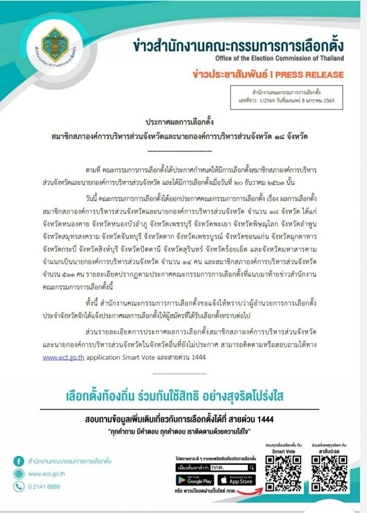 กรุงเทพฯ 8 ม.ค.-กกต. ประกาศผลการเลือกตั้ง อบจ. อีก 18 จังหวัด เป็นนายก อบจ. 14 คน และสมาชิก 511 คน