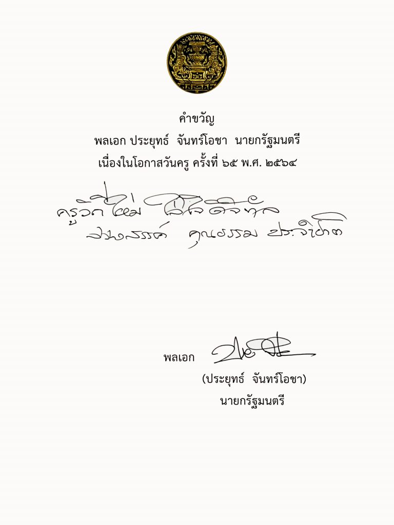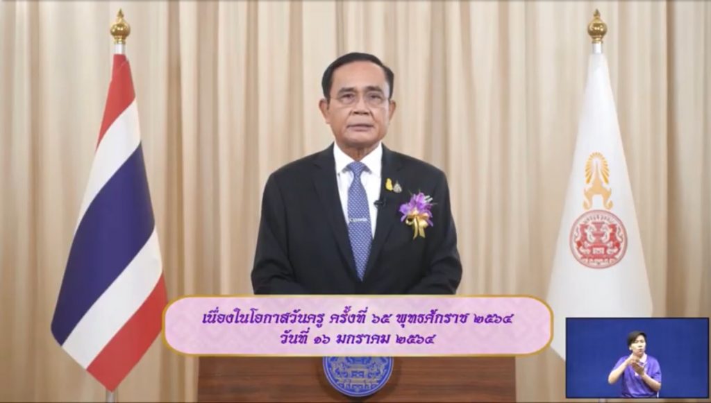พลเอกประยุทธ์ จันทร์โอชา นายกรัฐมนตรี และรัฐมนตรีว่าการกระทรวงกลาโหม กล่าวคำปราศรัยเนื่องในโอกาสวันครู 16 มกราคม 2564 ผ่านทางการถ่ายทอดสดออนไลน์ ว่า ครู เป็นบุคลากรสำคัญในการพัฒนาและขับเคลื่อนระบบการศึกษาของชาติ และมีบทบาทในการประสิทธิ์ประสาทวิชาความรู้ ท่ามกลางการเปลี่ยนแปลงที่เกิดขึ้นอย่างรวดเร็ว ในปัจจุบัน ครูยุคใหม่จึงต้องเป็นผู้อำนวยการในการเรียนรู้ เพื่อให้เด็กและเยาวชนเข้าถึงศาสตร์สาขาต่าง ๆ เป็นผู้ที่มีความรู้ครบถ้วน เป็นคนดี มีคุณธรรม และจริยธรรม พร้อมที่จะเติบโตเป็นพลเมืองที่ดีของประเทศ รัฐบาลมีนโยบายในการเสริมสร้างและพัฒนาครูและบุคลากรทางการศึกษาให้มีมาตรฐานวิชาชีพในระดับสากล ตลอดจนนำเทคโนโลยีซึ่งมีความก้าวหน้าและนวัตกรรมมาปรับใช้ในการจัดการศึกษา การพัฒนาบุคลากร และการจัดทำแผนการศึกษาเพื่อพัฒนาเยาวชนในทุกช่วงวัยให้เป็นทรัพยากรมนุษย์ที่มีคุณค่าและมีศักยภาพสูง ดังนั้น อนาคตของชาติจึงอยู่ที่การศึกษา และการศึกษาที่มีคุณภาพย่อมเกิดจากครูที่มีคุณภาพด้วย