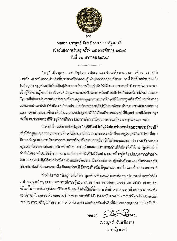 “วันครูปีนี้ ผมได้มอบคำขวัญว่า ครูวิถีใหม่ ใส่ใจดิจิทัล สร้างสรรค์คุณธรรมประจำชาติ เพื่อให้ครูและบุคลากรทางการศึกษาได้ตระหนักถึงบทบาทและหน้าที่ของครูในยุคชีวิตวิถีใหม่ที่ต้องมีการปรับรูปแบบการเรียนการสอน และสร้างนวัตกรรมการเรียนรู้ให้พร้อมตอบสนองต่อการเปลี่ยนแปลงครูจึงต้องได้รับการพัฒนา เสริมสร้างทักษะ ความรู้ และความสามารถด้านดิจิทัล เพื่อให้การปฏิบัติหน้าที่ดำเนินไปอย่างมีประสิทธิภาพ เหมาะสมกับการดำเนินชีวิตวิถีใหม่” พลเอกประยุทธ์ กล่าว