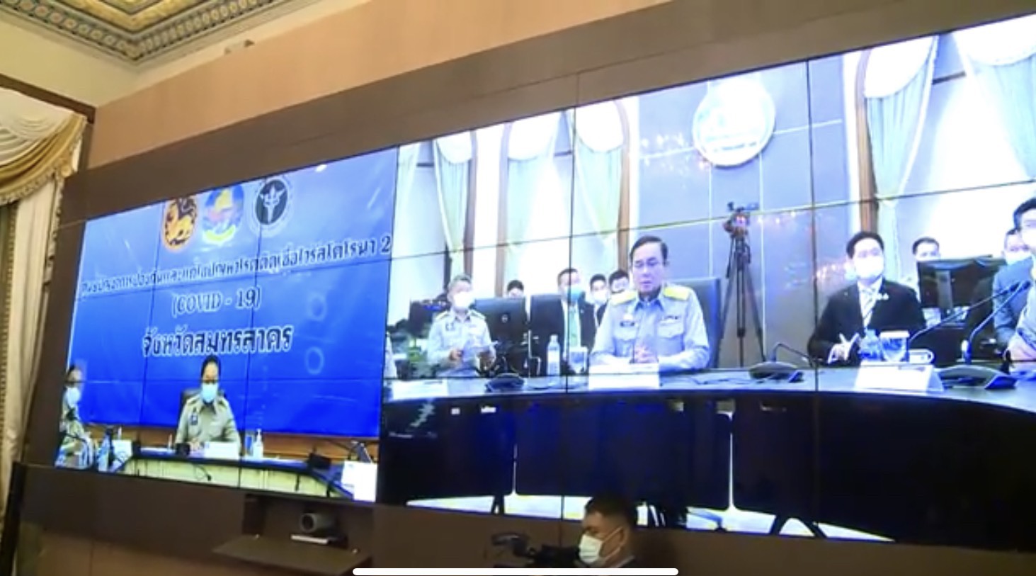 พล.อ.ประยุทธ์ จันทร์โอชา นายกรัฐมนตรีและรัฐมนตรีว่าการกระทรวงกลาโหม พร้อมด้วยนายอนุทิน ชาญวีรกูล รองนายกรัฐมนตรีและรัฐมนตรีว่าการกระทรวงสาธารณสุข พล.อ.อนุพงษ์ เผ่าจินดา รัฐมนตรีว่าการกระทรวงมหาดไทยและ ตัวแทนหน่วยงานที่เกี่ยวข้อง ร่วมประชุมผ่านระบบวีดิทัศน์ทางไกล หรือ Video Conference จากตึกไทยคู่ฟ้า ทำเนียบรัฐบาล ไปยังจังหวัดสมุทรสาคร ที่มีนายธีรพัฒน์ คัชรมาตย์ รองผู้ว่าราชการจังหวัดสมุทรสาคร นพ.ธรรมวิทย์ เกื้อกูลเกียรติ ผู้อำนวยการโรงพยาบาลกระทุ่มแบน นพ.อนุกูล ไทยถานันดร์ ผู้อำนวยการโรงพยาบาลสมุทรสาคร นพ.พรเทพ พงศ์ทวิกร ผู้อำนวยการโรงพยาบาลบ้านแพ้ว และหน่วยงานที่เกี่ยวข้องร่วมประชุม