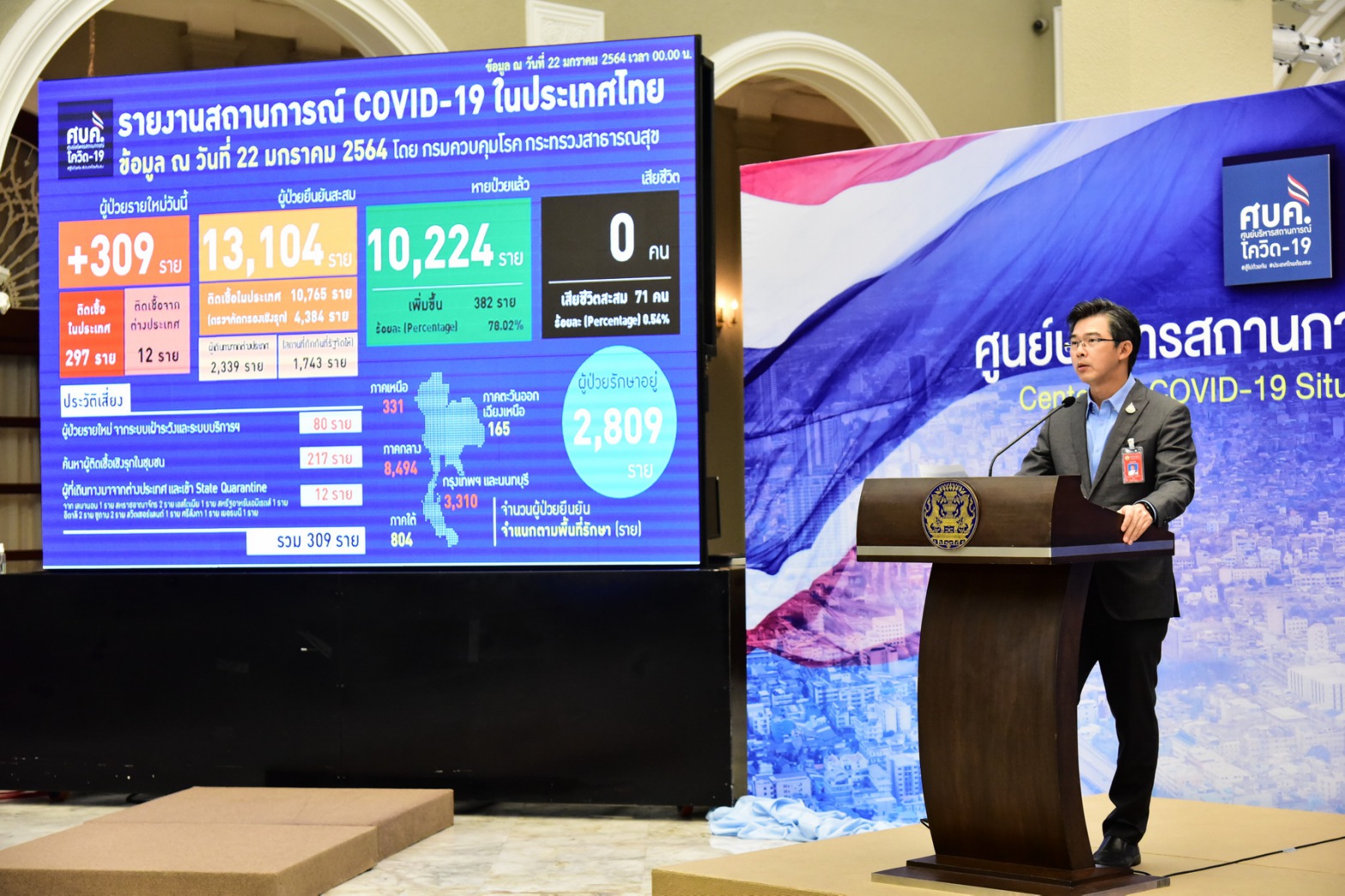 นพ.ทวีศิลป์ วิษณุโยธิน โฆษกศูนย์บริหารสถานการณ์การแพร่ระบาดของโรคติดเชื้อไวรัสโคโรน่า 2019 (โควิด-19) หรือ ศบค. รายงานตัวเลขผู้ติดเชื้อโควิด 19 วันนี้ เพิ่มขึ้น 309 ราย ผู้ป่วยยืนยันสะสม 13,104 ราย หายป่วยแล้ว 10,224 ราย รักษาตัวอยู่ที่โรงพยาบาล 2,572 ราย ผู้เสียชีวิตสะสมรวม 71 คน ผู้ป่วยยืนยันสะสมระลอกใหม่ตั้งแต่วันที่ 15 ธันวาคม 2563 – 22 มกราคม 2564 จำนวน 8,867 ราย ผู้ติดเชื้อทั้ง 309 ราย เป็นการติดเชื้อในประเทศ 297 ราย เป็นผู้ป่วยรายใหม่จากระบบเฝ้าระวังและบริการ 80 ราย ,จากการค้นหาเชิงรุกในชุมชน 217 ราย