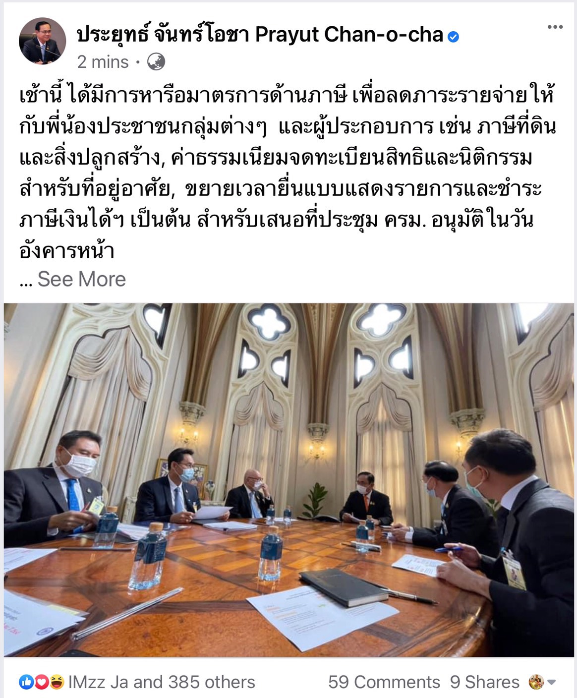 พล.อ.ประยุทธ์ จันทร์โอชา นายกรัฐมนตรีและรัฐมนตรีว่าการกระทรวงกลาโหม โพสต์ข้อความผ่านเฟซบุ๊ก Wประยุทธ์ จันทร์โอชา Prayut Chan-o-cha”ว่า เช้านี้ได้หารือมาตรการด้านภาษี เพื่อลดภาระรายจ่ายให้กับพี่น้องประชาชนกลุ่มต่าง ๆ และผู้ประกอบการ เช่น ภาษีที่ดินและสิ่งปลูกสร้าง ค่าธรรมเนียมจดทะเบียนสิทธิและนิติกรรมสำหรับที่อยู่อาศัย ขยายเวลายื่นแบบแสดงรายการและชำระภาษีเงินได้ฯ เป็นต้น โดยจะเสนอที่ประชุมคณะรัฐมนตรี(ครม.) อนุมัติในวันอังคารที่ 26 มกราคมนี้
