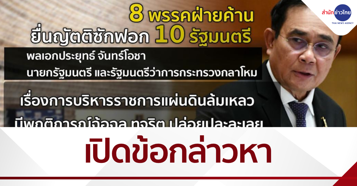 กรุงเทพฯ 25 ม.ค. – ฝ่ายค้านยื่นญัตติอภิปรายไม่ไว้วางใจรัฐมนตรี 10 คน อ้างเหตุบริหารราชการล้มเหลว มั่นใจในข้อมูลที่จะอภิปรายว่าน็อกรัฐบาล รวมถึงเอาผิดทางกฎหมายได้ด้วย.-สำนักข่าวไทย