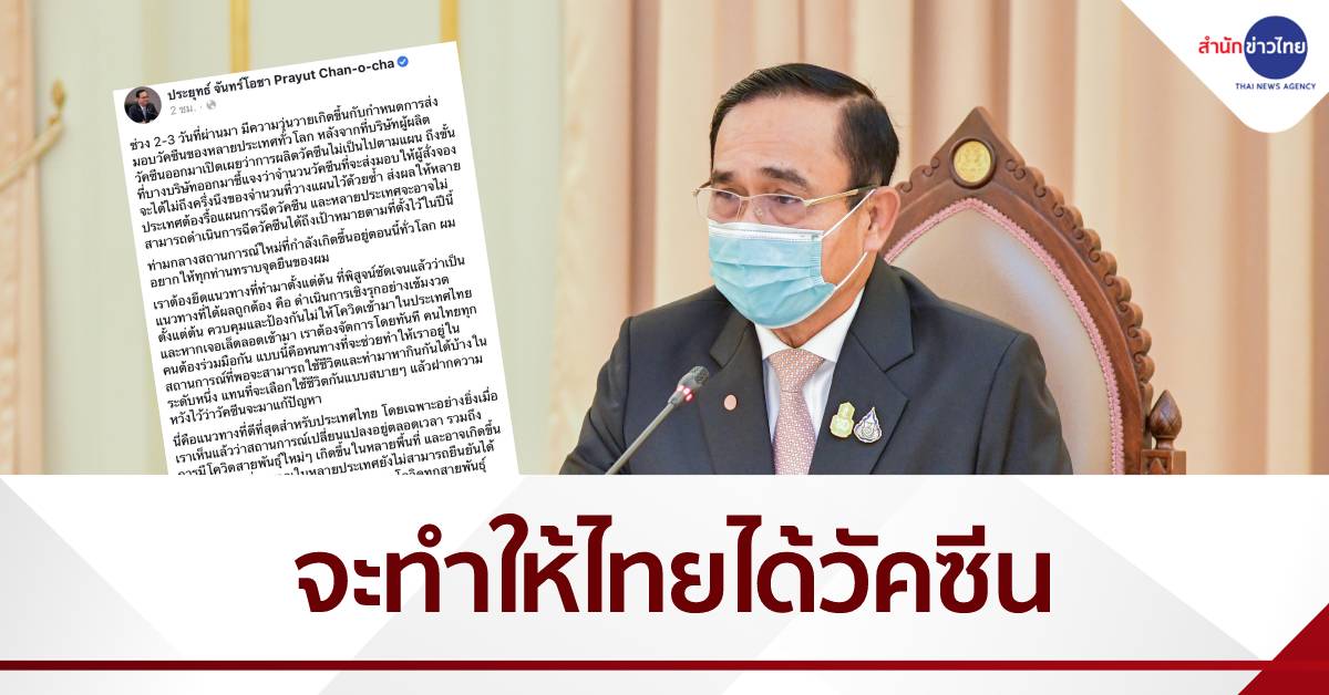 ผู้สื่อข่าวรายงานว่า พลเอกประยุทธ์ จันทร์โอชา นายกรัฐมนตรีและรัฐมนตรีว่าการกระทรวงกลาโหม โพสต์ข้อความผ่านเฟซบุ๊ก “ประยุทธ์ จันทร์โอชา Prayut Chan-o-cha” ว่า ช่วง 2-3 วันที่ผ่านมา มีความวุ่นวายเกิดขึ้นกับกำหนดการส่งมอบวัคซีนของหลายประเทศทั่วโลก หลังจากที่บริษัทผู้ผลิตวัคซีนออกมาเปิดเผยว่าการผลิตวัคซีนไม่เป็นไปตามแผน ถึงขั้นที่บางบริษัทออกมาชี้แจงว่าจำนวนวัคซีนที่จะส่งมอบให้ผู้สั่งจอง จะได้ไม่ถึงครึ่งนึงของจำนวนที่วางแผนไว้ด้วยซ้ำ ส่งผลให้หลายประเทศต้องรื้อแผนการฉีดวัคซีน และหลายประเทศจะอาจไม่สามารถดำเนินการฉีดวัคซีนได้ถึงเป้าหมายตามที่ตั้งไว้ในปีนี้