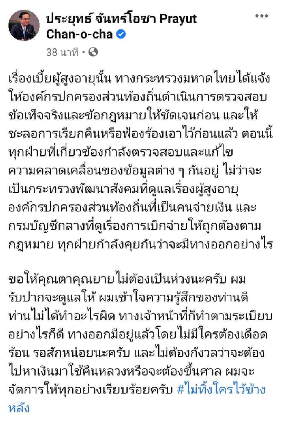 พล.อ.ประยุทธ์ จันทร์โอชา นายกรัฐมนตรี โพสต์เฟซบุ๊กส่วนตัวถึงเรื่องการเรียกเก็บเบี้ยผู้สูงอายุคืนว่ากระทรวงมหาดไทยได้แจ้งให้องค์กรปกครองส่วนท้องถิ่นดำเนินการตรวจสอบข้อเท็จจริงและข้อกฎหมายให้ชัดเจนก่อน และให้ชะลอการเรียกคืนหรือฟ้องร้องเอาไว้ก่อนแล้ว ตอนนี้ทุกฝ่ายที่เกี่ยวข้องกำลังตรวจสอบและแก้ไขความคลาดเคลื่อนของข้อมูลต่าง ๆ กันอยู่ ไม่ว่าจะเป็นกระทรวงพัฒนาสังคมที่ดูแลเรื่องผู้สูงอายุ องค์กรปกครองส่วนท้องถิ่นที่เป็นคนจ่ายเงิน และกรมบัญชีกลางที่ดูเรื่องการเบิกจ่ายให้ถูกต้องตามกฎหมาย ทุกฝ่ายกำลังคุยกันว่าจะมีทางออกอย่างไร
