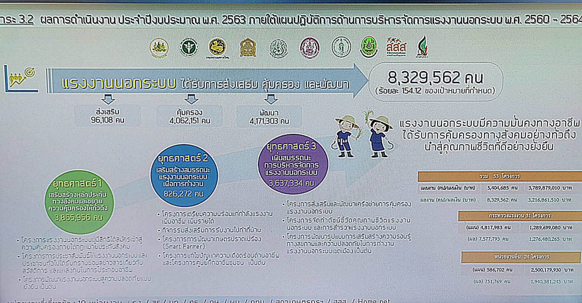 การประชุมวันนี้(10 ก.พ.) รับทราบสถานการณ์ปัจจุบันของแรงงานนอกระบบ ผลการดำเนินงานประจำปีงบประมาณ พ.ศ.2563 ภายใต้แผนปฏิบัติการด้านการบริหารจัดการแรงงานนอกระบบ พ.ศ.2560 – 2564 ความคืบหน้าร่างพระราชบัญญัติส่งเสริมและพัฒนาคุณภาพชีวิตแรงงานนอกระบบ พ.ศ. … ความคืบหน้าการดำเนินงานฟื้นฟูคุณภาพชีวิตแรงงานนอกระบบที่ได้รับผลกระทบจากการแพร่ระบาดของโรคติดเชื้อไวรัสโคโรนา 2019 (โควิด-19) นอกจากนี้ ที่ประชุมยังพิจารณา (ร่าง) แผนปฏิบัติการด้านการบริหารจัดการแรงงานนอกระบบ พ.ศ.2563 – 2565 (ร่าง) แผนปฏิบัติการ (Action Plan) ประจำปีงบประมาณ พ.ศ.2564 ภายใต้ (ร่าง) แผนปฏิบัติการด้านการบริหารจัดการแรงงานนอกระบบ พ.ศ.2563 – 2565 และปรับปรุงคำสั่งแต่งตั้งคณะอนุกรรมการเพื่อประสานและขับเคลื่อนนโยบายการบริหารจัดการแรงงานนอกระบบอีกด้วย