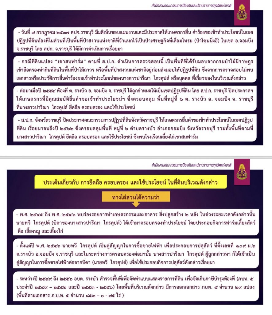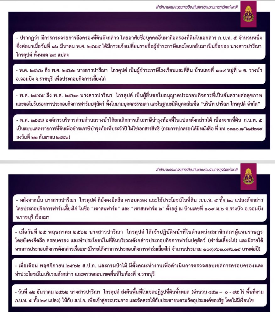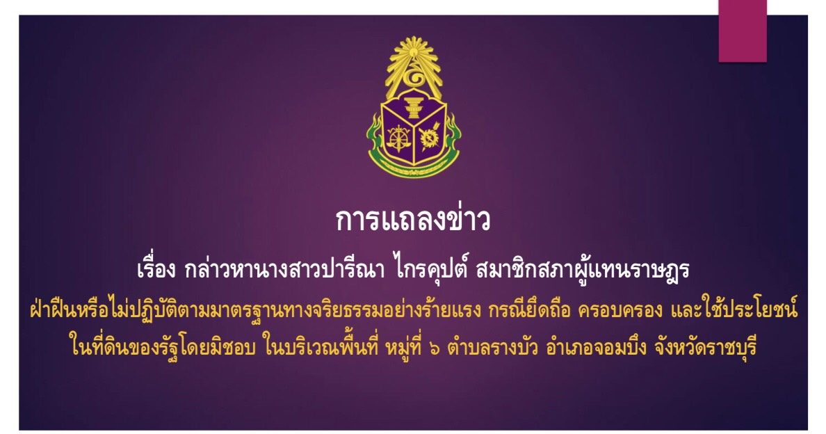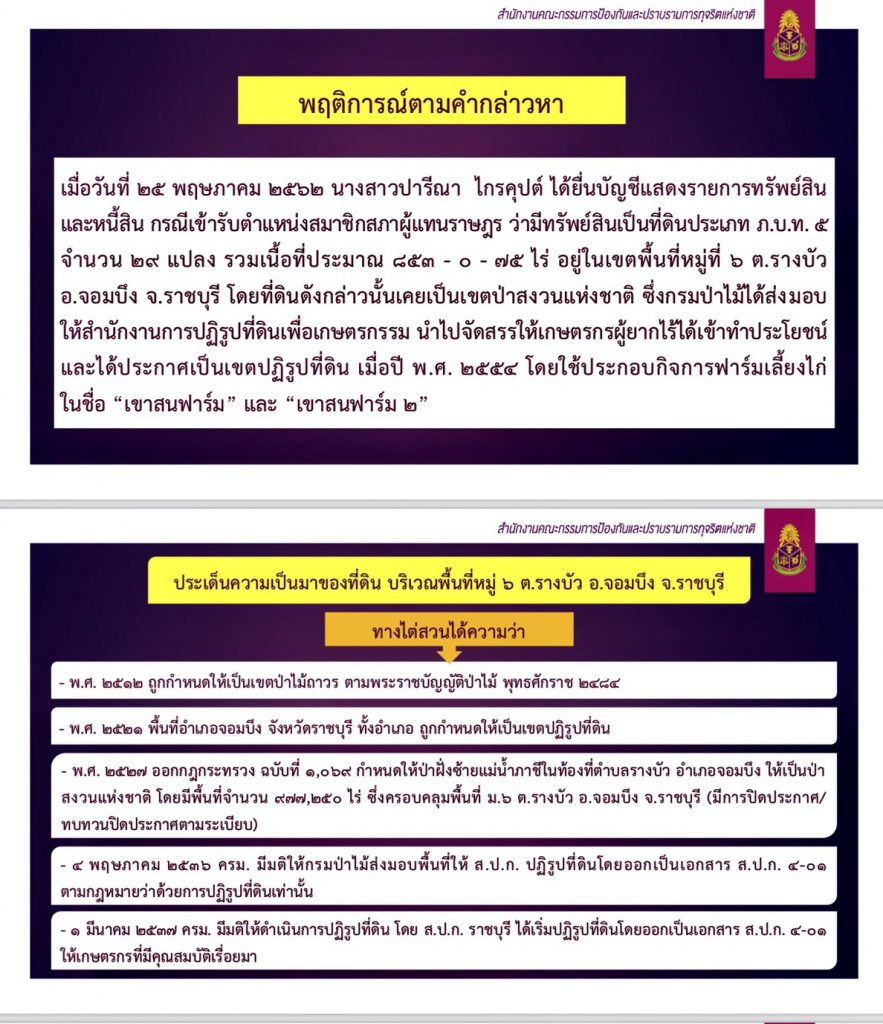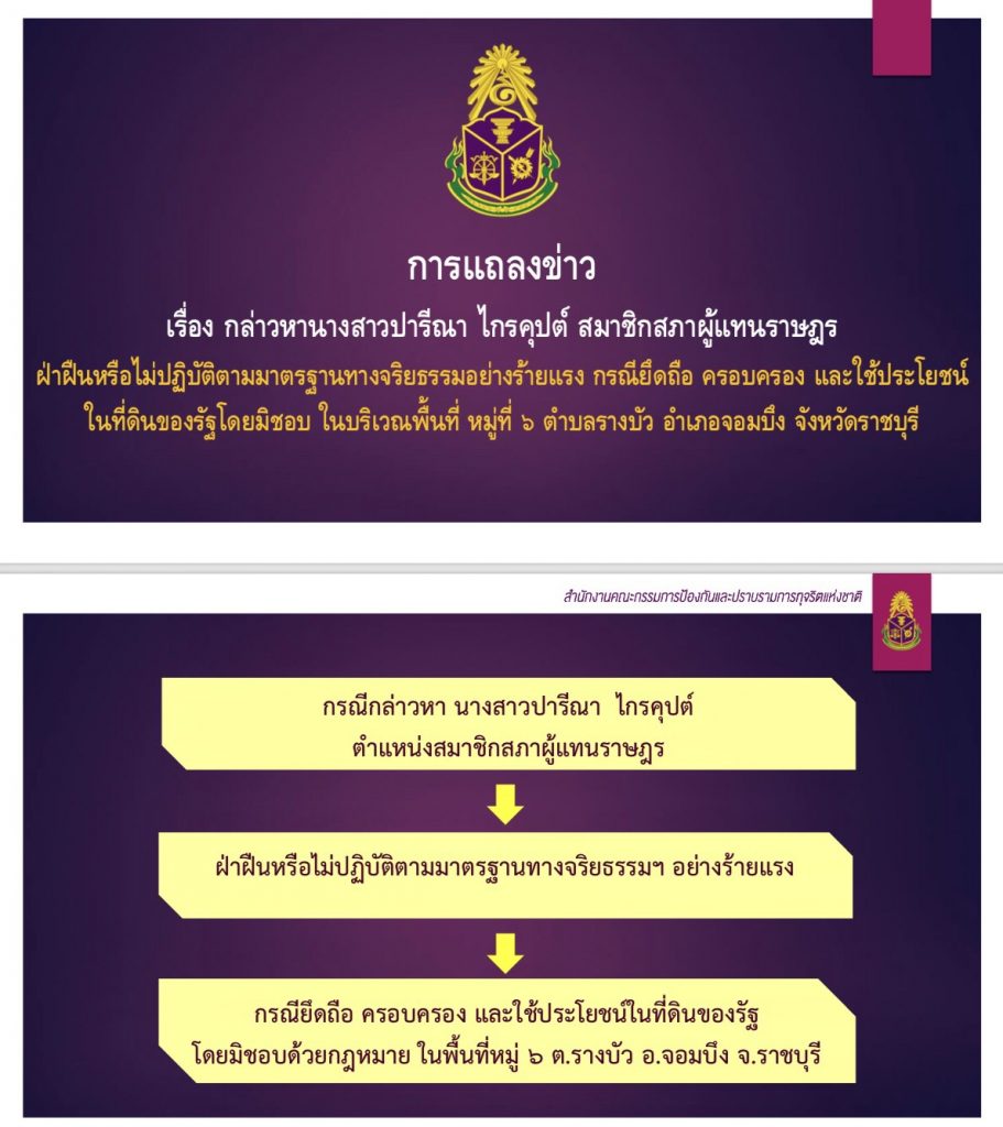 10 ก.พ. – วันนี้ (10 ก.พ.64) นายนิวัติไชย เกษมมงคล รองเลขาธิการคณะกรรมการป้องกันและปราบปรามการทุจริตแห่งชาติ (ป.ป.ช.) ในฐานะโฆษก ป.ป.ช. แถลงข่าวชี้มูล นางสาวปารีณา ไกรคุปต์ สมาชิกสภาผู้แทนราษฎร พรรคพลังประชารัฐ กรณีฝ่าฝืนหรือไม่ปฏิบัติตามมาตรฐานทางจริยธรรมอย่างร้ายแรง กรณียึดถือครอบครองและใช้ประโยชน์ในที่ดินของรัฐโดยมิชอบ ในบริเวณพื้นที่หมู่ที่ 6 ตำบลรางบัว อำเภอจอมบึง จังหวัดราชบุรี ตามที่กรมป่าไม้ได้ร้องทุกข์ต่อกองบังคับการปราบปรามการกระทำความผิดเกี่ยวกับทรัพยากรธรรมชาติและสิ่งแวดล้อม (บก.ปทส.) ให้ดำเนินคดีอาญากับนางสาวปารีณา ในข้อหาบุกรุกที่ดินของรัฐ เป็นพื้นที่ 711 – 2 – 93 ไร่ และคำนวณค่าเสียหายเป็นตัวเงิน จำนวน 36,224,791 บาท